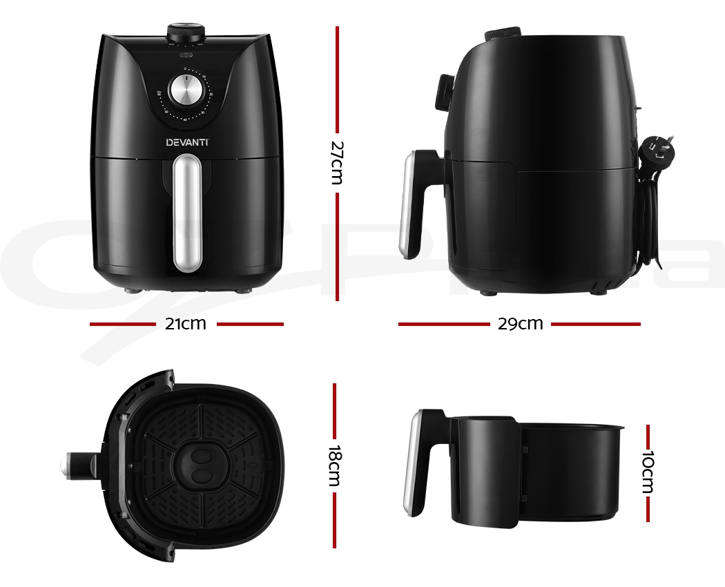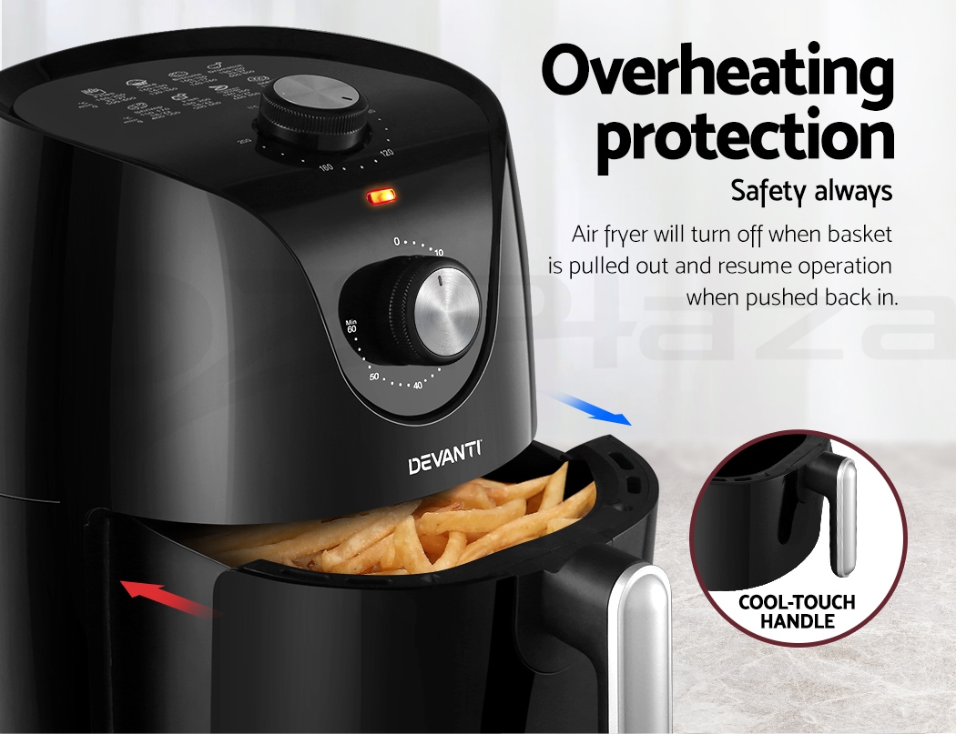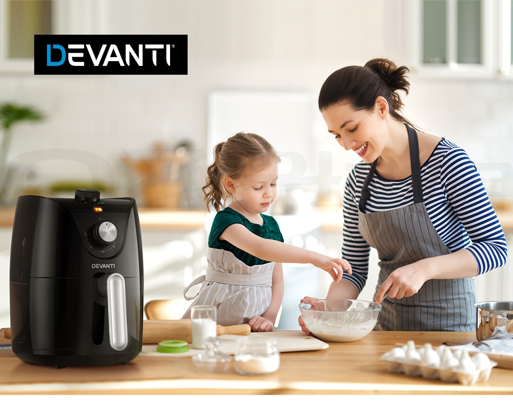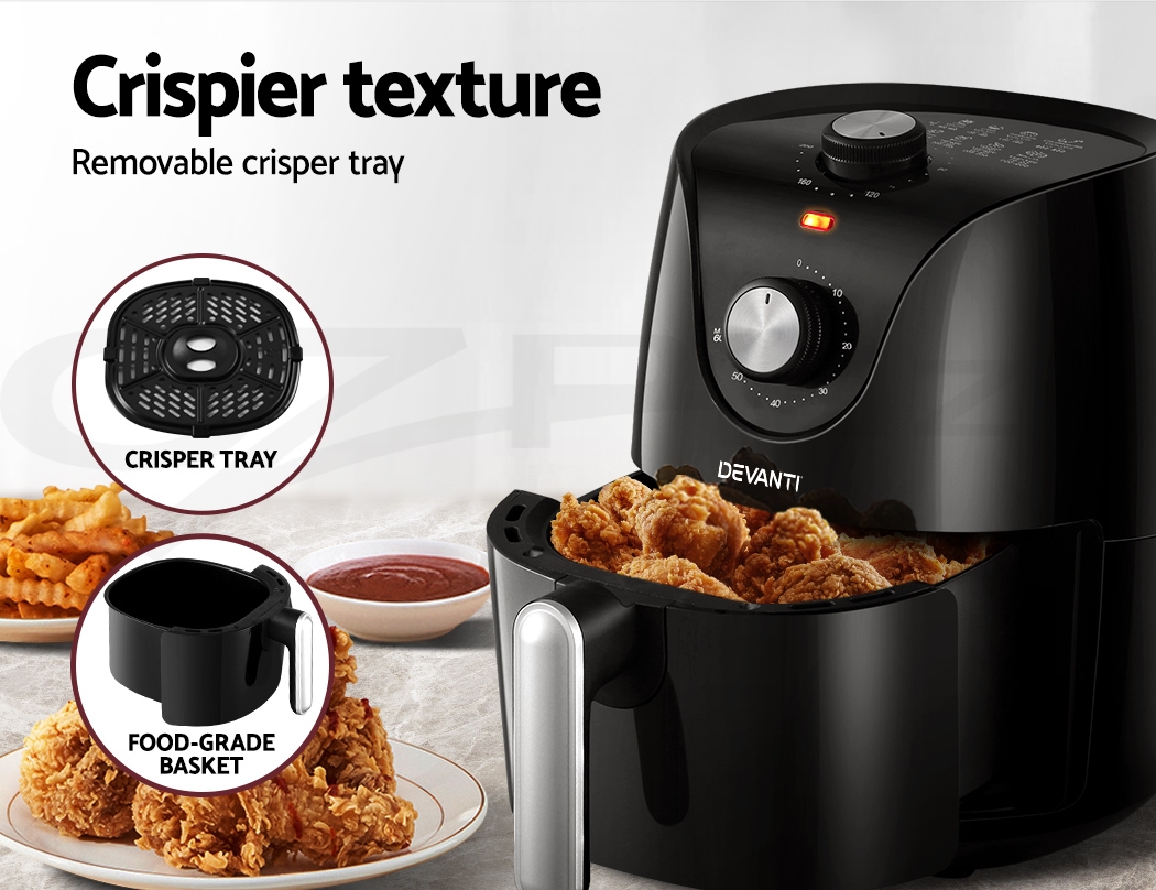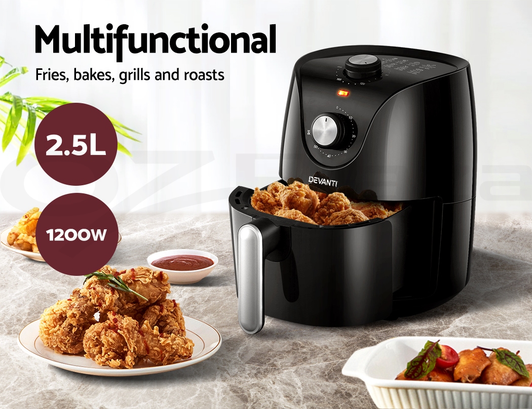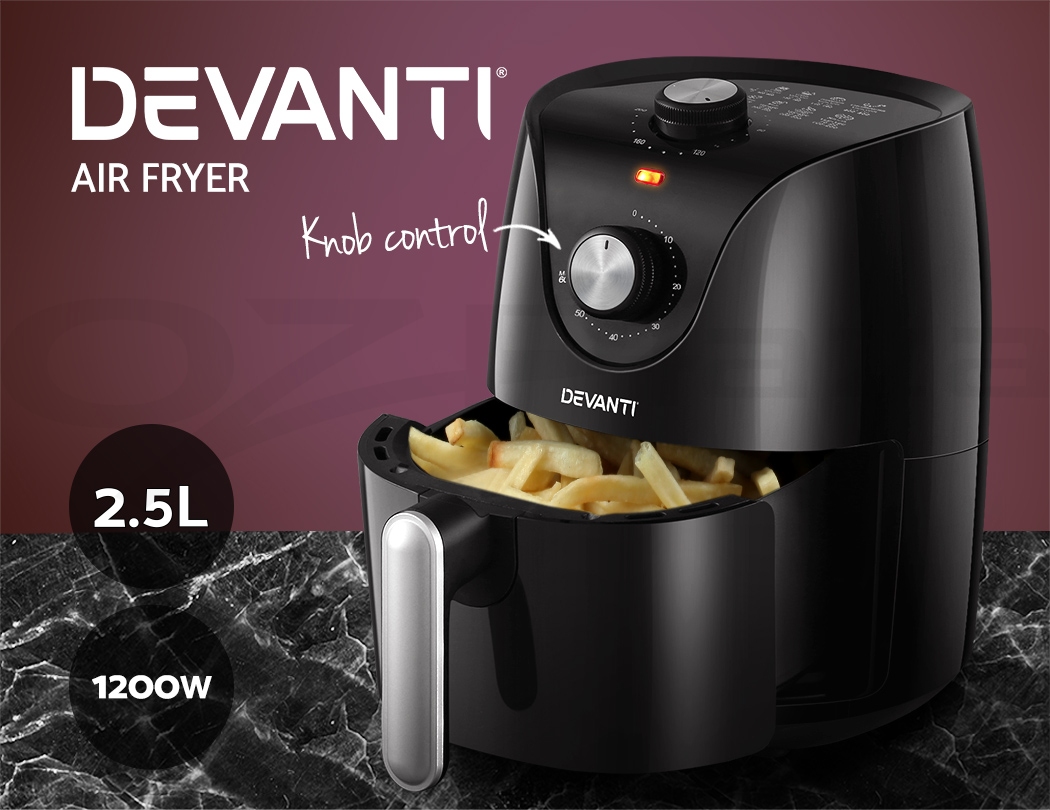 Enjoy your favourite fried foods without guilt thanks to the Devanti 2.5L Air Fryer. With their smooth and stunning sleek exterior, our Devanti Air Fryers turn ordinary food into extraordinary dishes thanks to their exceptional cooking abilities. With its innovative air frying technology and 1200W of power, you can cook quickly and efficiently. The 2.5L capacity is perfect when cooking for one, or making sides and snacks for the family. Better still, all this wonderful cooking is done without a drop of oil and is as delicious and succulent as your favourite fried treats. Foods cooked in our air fryer have up to 80% less fat than regular deep-fried foods. Set the time and temperature with the easy-to-use knob controls and leave the rest to us. The interior features a non-stick pan for easy cleaning and a removable crisper tray for the ultimate crispy, crunchy experience. It also features an automatic shut-off switch, a cool touch handle, a heat shield vent, and non-slip feet for safety. Get yours today and see the benefits of fat-free cooking!