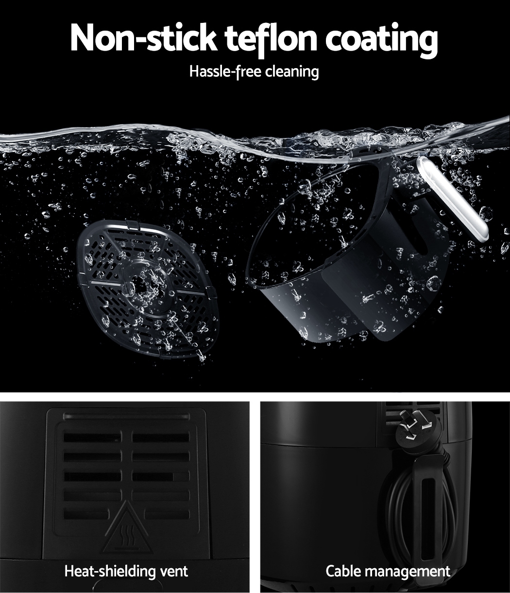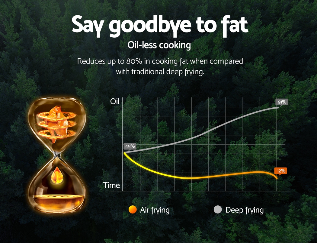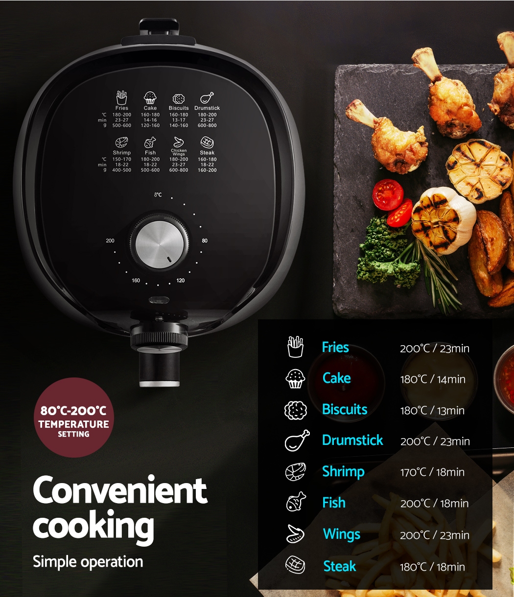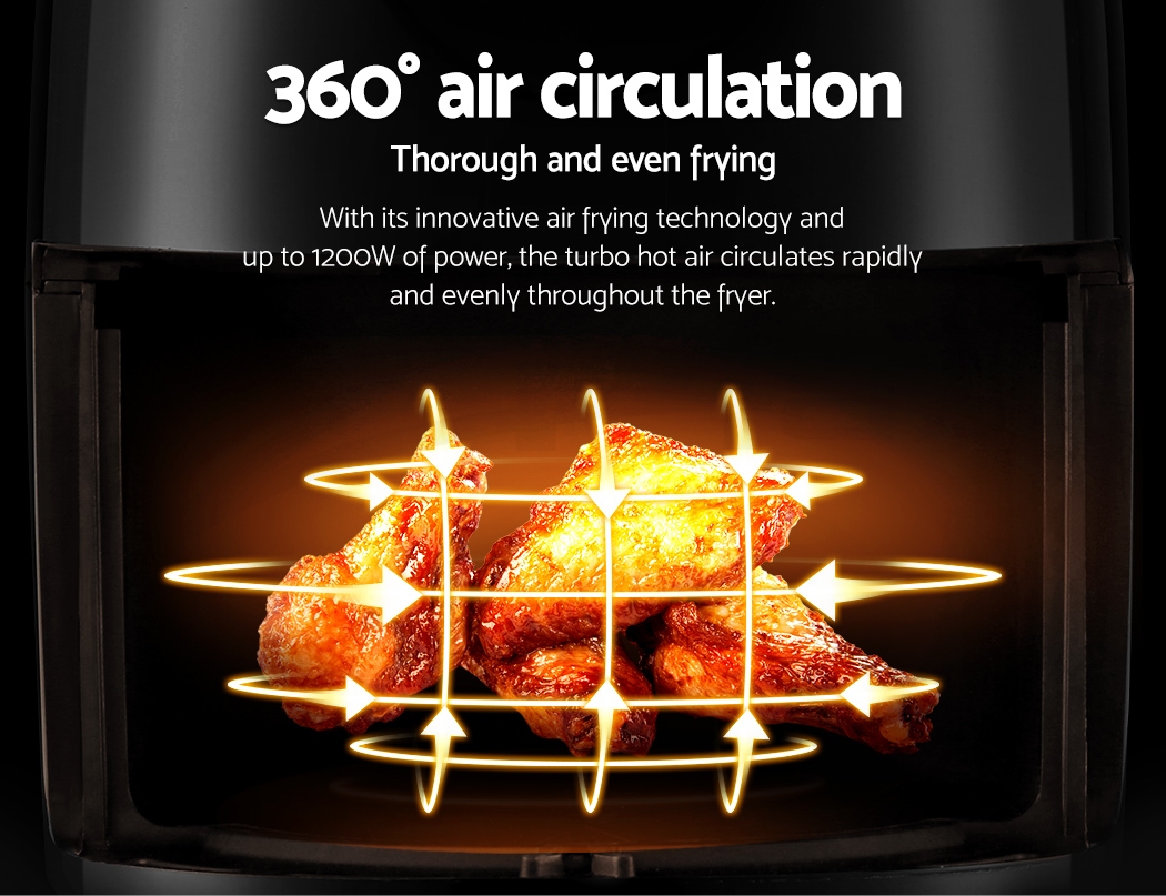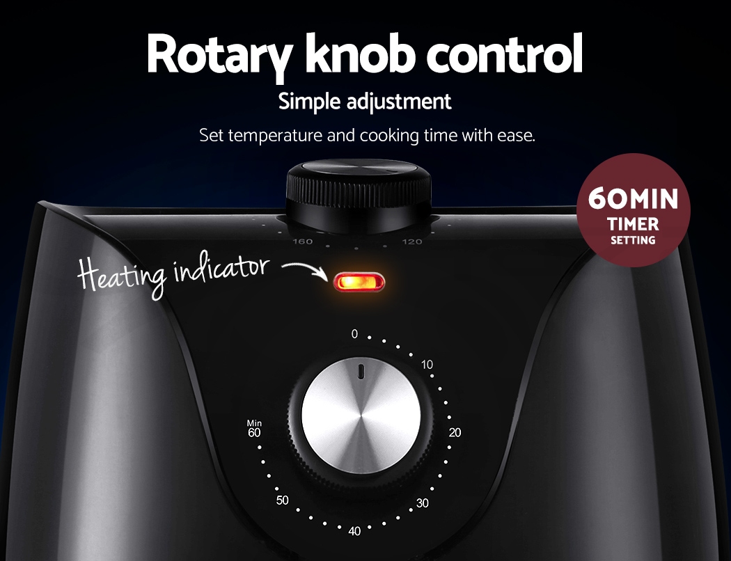 Enjoy your favourite fried foods without guilt thanks to the Devanti 2.5L Air Fryer. With their smooth and stunning sleek exterior, our Devanti Air Fryers turn ordinary food into extraordinary dishes thanks to their exceptional cooking abilities. With its innovative air frying technology and 1200W of power, you can cook quickly and efficiently. The 2.5L capacity is perfect when cooking for one, or making sides and snacks for the family. Better still, all this wonderful cooking is done without a drop of oil and is as delicious and succulent as your favourite fried treats. Foods cooked in our air fryer have up to 80% less fat than regular deep-fried foods. Set the time and temperature with the easy-to-use knob controls and leave the rest to us. The interior features a non-stick pan for easy cleaning and a removable crisper tray for the ultimate crispy, crunchy experience. It also features an automatic shut-off switch, a cool touch handle, a heat shield vent, and non-slip feet for safety. Get yours today and see the benefits of fat-free cooking!
