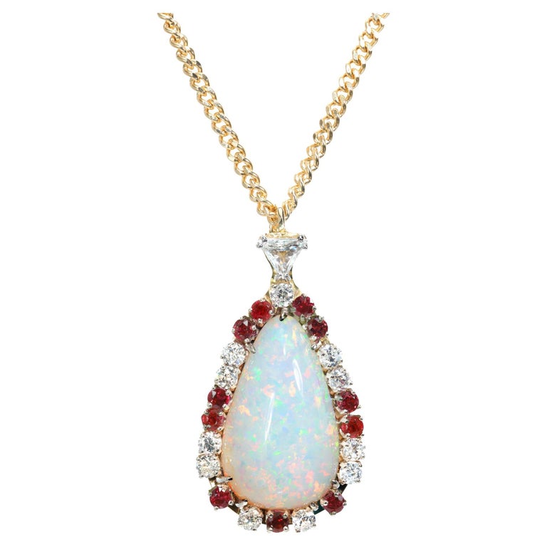 1960's Opal, ruby and diamond pendant necklace. GIA certified 27.03 carat pear shape opal with a halo of 11 round diamonds and 11 round rubies. Accented with 1 trilliant cut diamond in a 14k yellow and white gold setting with a 22 inch yellow gold chain. GIA certified natural with bright white translucent body color and distinct flashes of reddish orange, green and blue. The rubies are GIA certified simple heat only.
