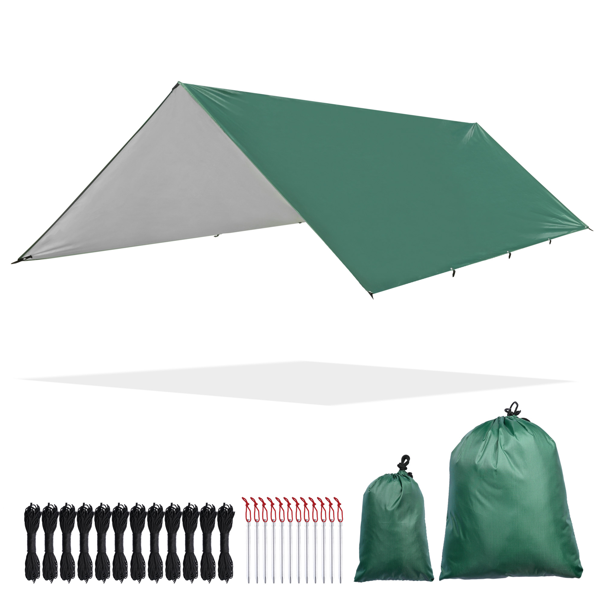 UV Protection & Water Resistance - Made of 210D oxford fabric with silver PA coating, the tarp offers UV50+ protection for protecting you from sunlight, avoiding sunburn and reducing temperature in hot summer; shelter with PU3000mm water resistance is suitable for using on drizzling days; durable material ensures wear resistance and tear resistance for frequent use