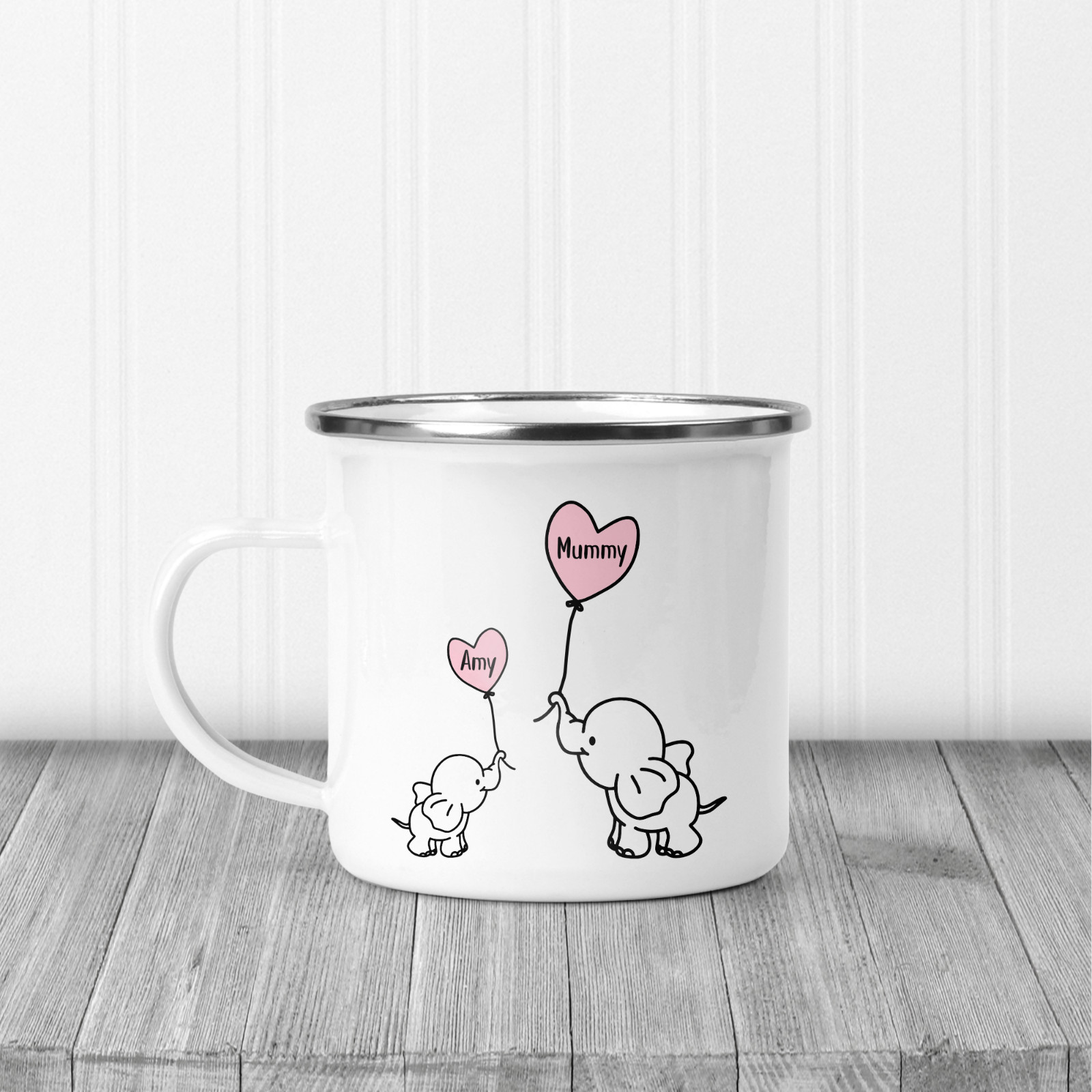 12oz enamel mugs with silver rim.