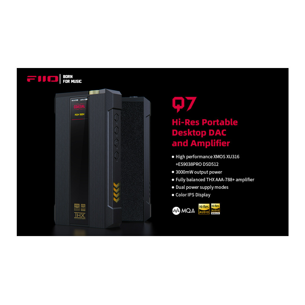 The FiiO Q7 High-Resolution Portable Desktop DAC and Fully Balanced THX AAA-788+ Amplifier features desktop-level amplification with 100 percent more power under a DC power supply in Enhanced over-ear headphone mode up to 3000mW of power.