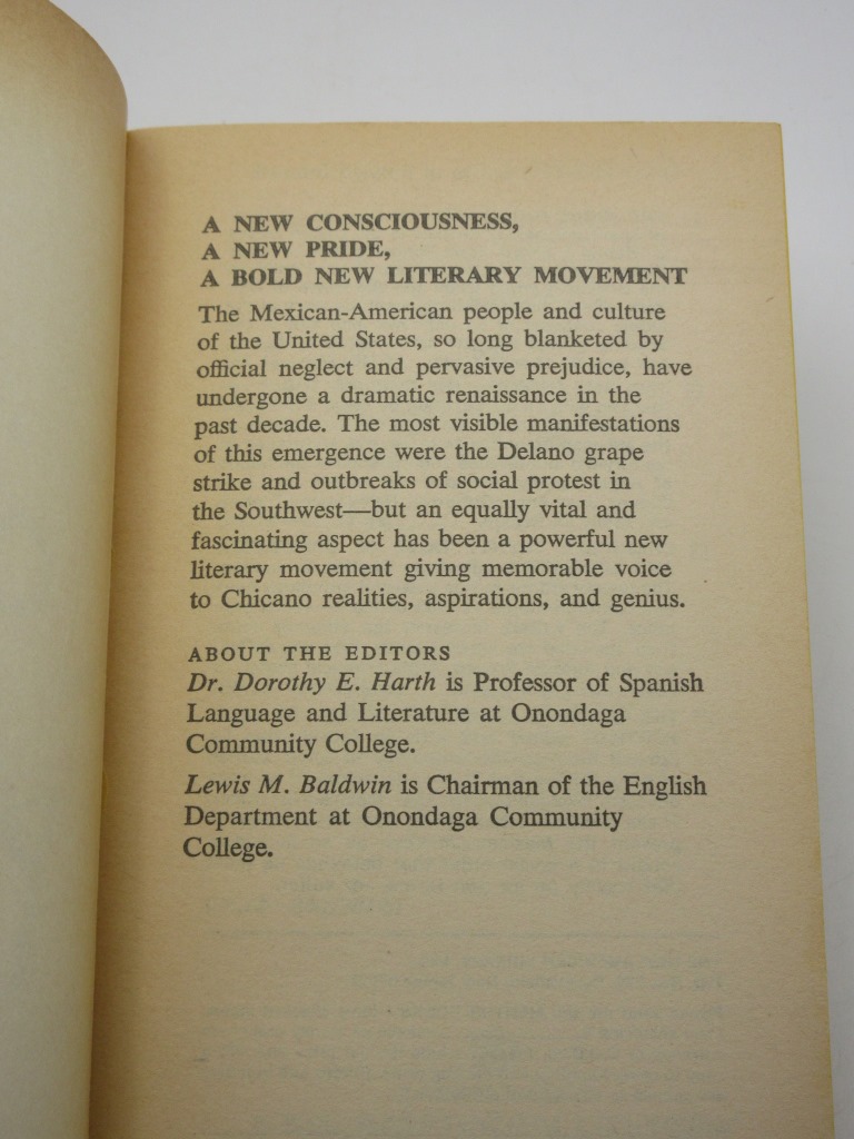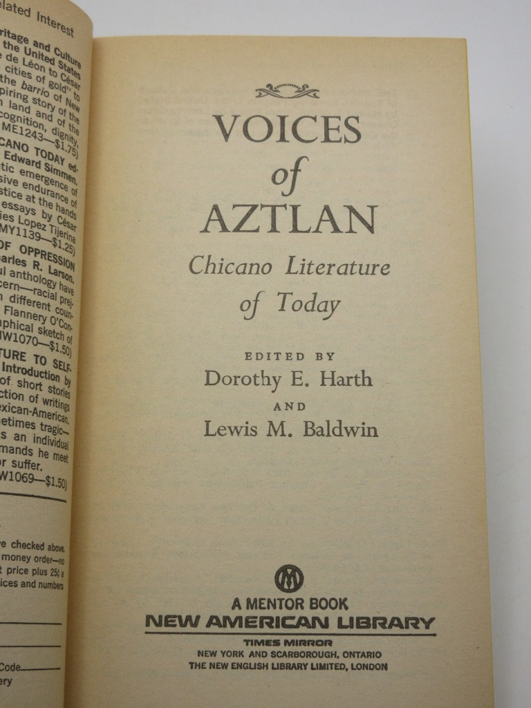 Voices of Aztlan Chicano Literature of Today (Mentor Book No. MJ1296) By Dorothy E. Harth (Ed.) / Lewis M. Baldwin (Ed.) New York: Approx Size: 4.25 x 7 inches (10.5 x 18 cms) Paperback. 246 printed pages First printing. Card wraps with yellow dyed page edges. Light marking and slight fading to top page edge, original price scratched from front cover, otherwise excellent. A scarce early Chicano anthology. Overall Condition is Very Good + There are many more rare and collectable books in our eBay shop, all at very reasonable prices Why not take a look... HERE Keyword SearchTerms: Chicano, Mexican-American Fiction |