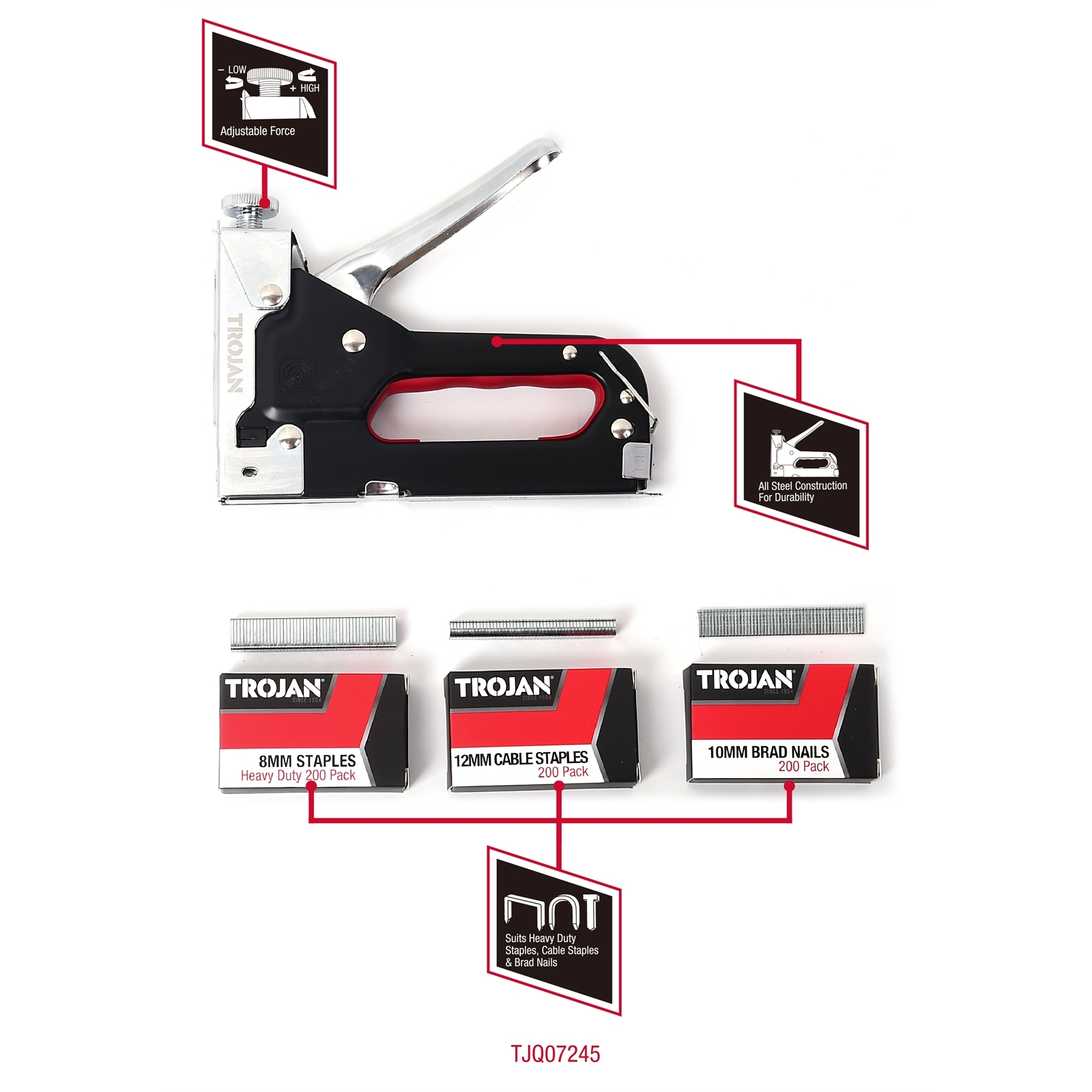 - Includes: 200 x 8mm Flat Staples, 200 x 12mm Cable Staples, 200 x 10mm Brad Nails