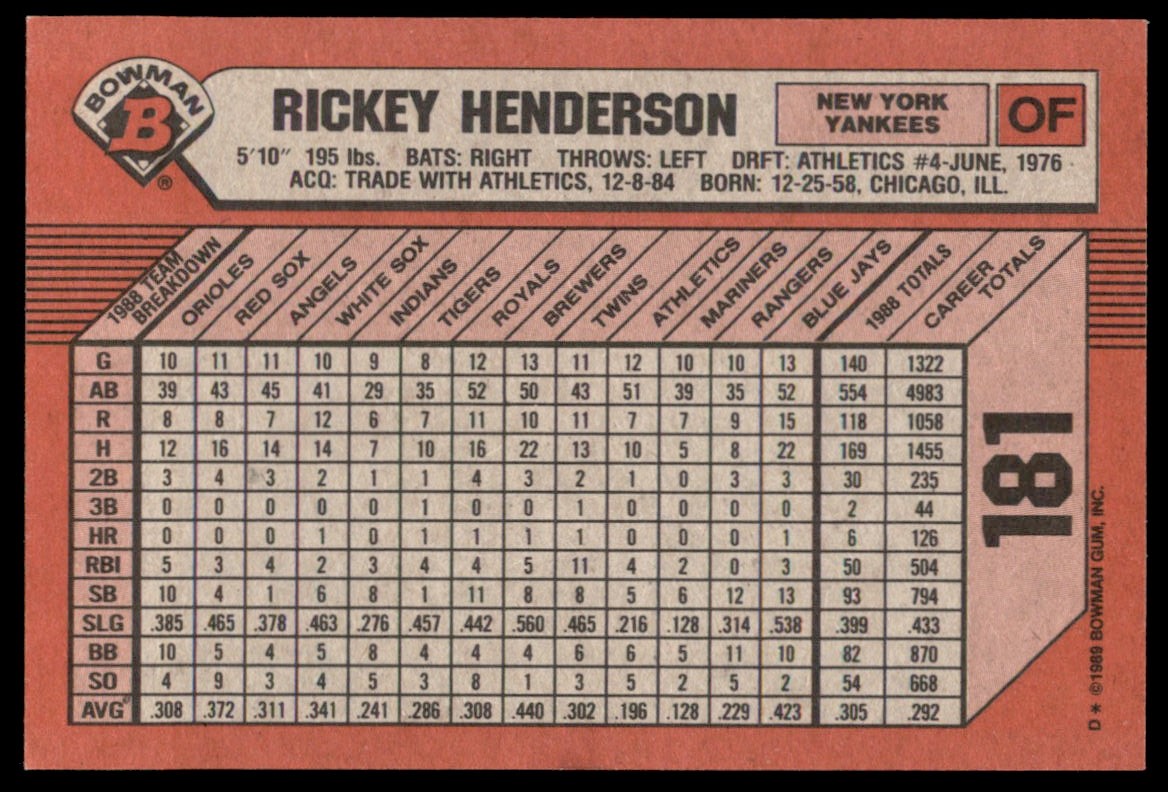 | Description: | Rickey Henderson | | Category: | Baseball | | Year: | 1989 | | Product: | Bowman | | Team: | New York Yankees | | Card Number: | 181 | | Dimensions: | 3¾" x 2½" |