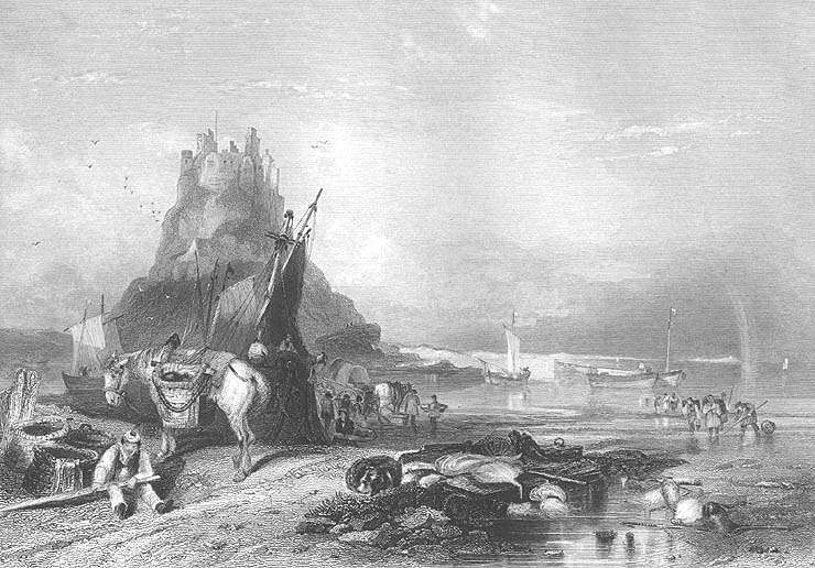 The Castle of Holy Island stands on a steep rock, about half a mile to the eastward of the Abbey. It is wholly inaccessible, except by a winding pass cut through the rock on the south side. The date of its foundation is unknown; but it is supposed to have been first built by the monks, as a place of refuge against the piratical attacks of the Danes, who frequently annoyed them, and twice burnt their abbey. The most memorable event in the meagre history of this castle is its capture for the Pretender, by two men, Launcelot Errington, and his nephew Mark, in 1715. The garrison at that time consisted of a sergeant, a corporal, and ten or twelve men. Errington, who was master of a little vessel then lying in the harbour, invited the sergeant, and such of his men as were not on duty, to drink with him on board of his ship. The invitation being accepted, he plied them so well with brandy as to render them incapable of opposition. "Framing an excuse for going ashore, he proceeded to the castle with his nephew, and succeeded in turning out the old gunner, the corporal, and two soldiers, being all that were on duty. He then shut the gates, and hoisted the Pretender's colours, but being disappointed in the succour which he expected, and a party of the king's troops arriving from Berwick, he and his nephew made their escape over the castle walls, and endeavoured to conceal themselves among the rocks and sea-weed, to the south-eastward of the castle till it was dark, when they intended to swim to the mainland. In consequence of the rising of the tide, they were obliged to swim while it was yet light, and, being perceived by the soldiers, they were taken, and conveyed to Berwick gaol, from which, however, they broke out before they were brought to trial, and escaped to France. On the suppression of the rebellion they took the benefit of the general pardon, and returned to England.