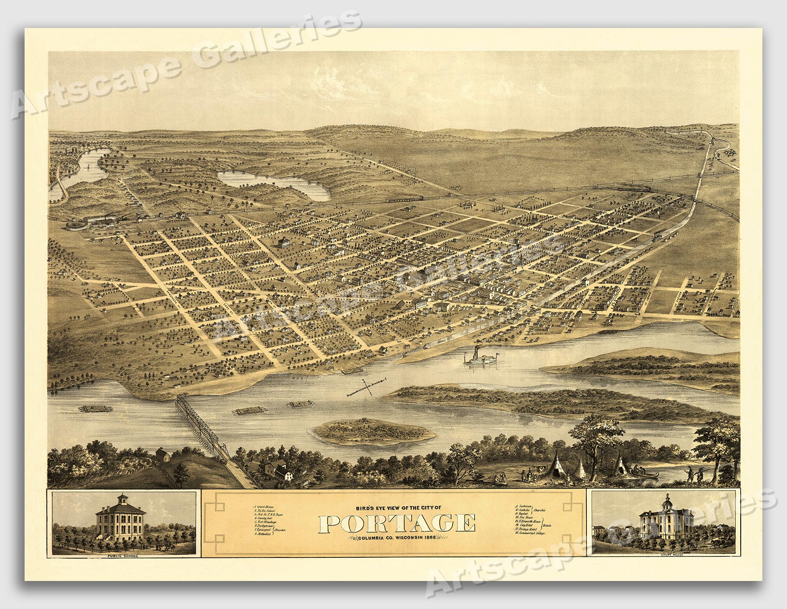 This great vintage style Panoramic City Map of Portage, Wisconsin shows a bird’s eye view as it looked in the late 19th century. Includes illustrations of the city as well as an index to buildings and points of interest.