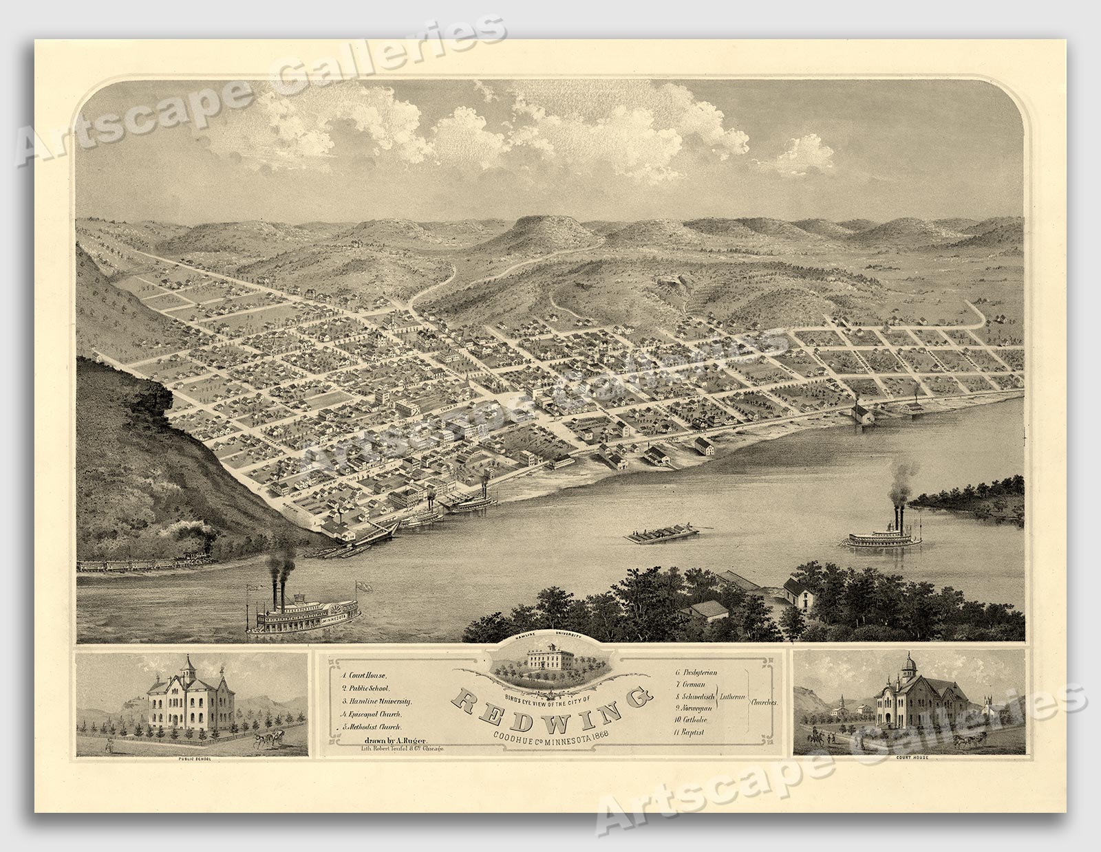 This great vintage style Panoramic City Map of Red Wing, Minnesota shows a bird’s eye view as it looked in the late 19th century. Includes illustrations of the city as well as an index to buildings and points of interest.