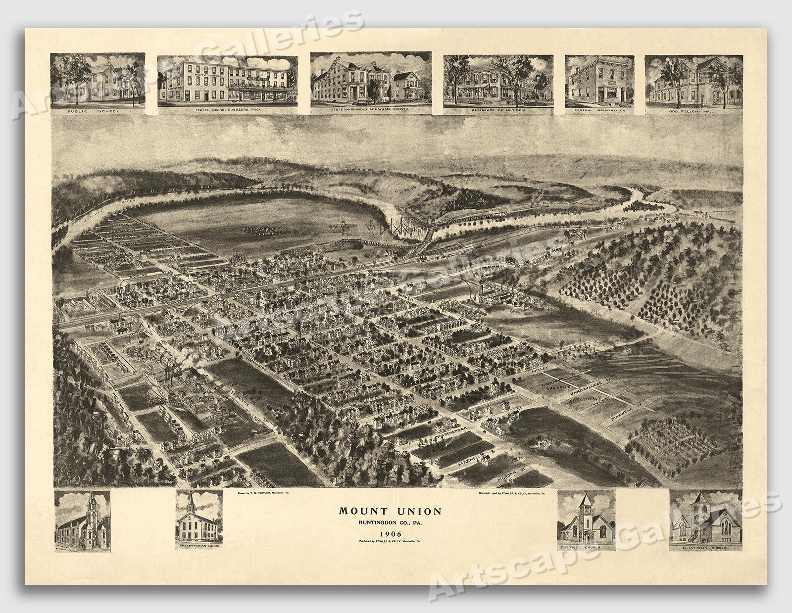 This great vintage style Panoramic City Map of Mount Union, Pennsylvania shows a bird’s eye view as it looked in the early 20th century. Includes illustrations of the city as well as an index to buildings and points of interest.
