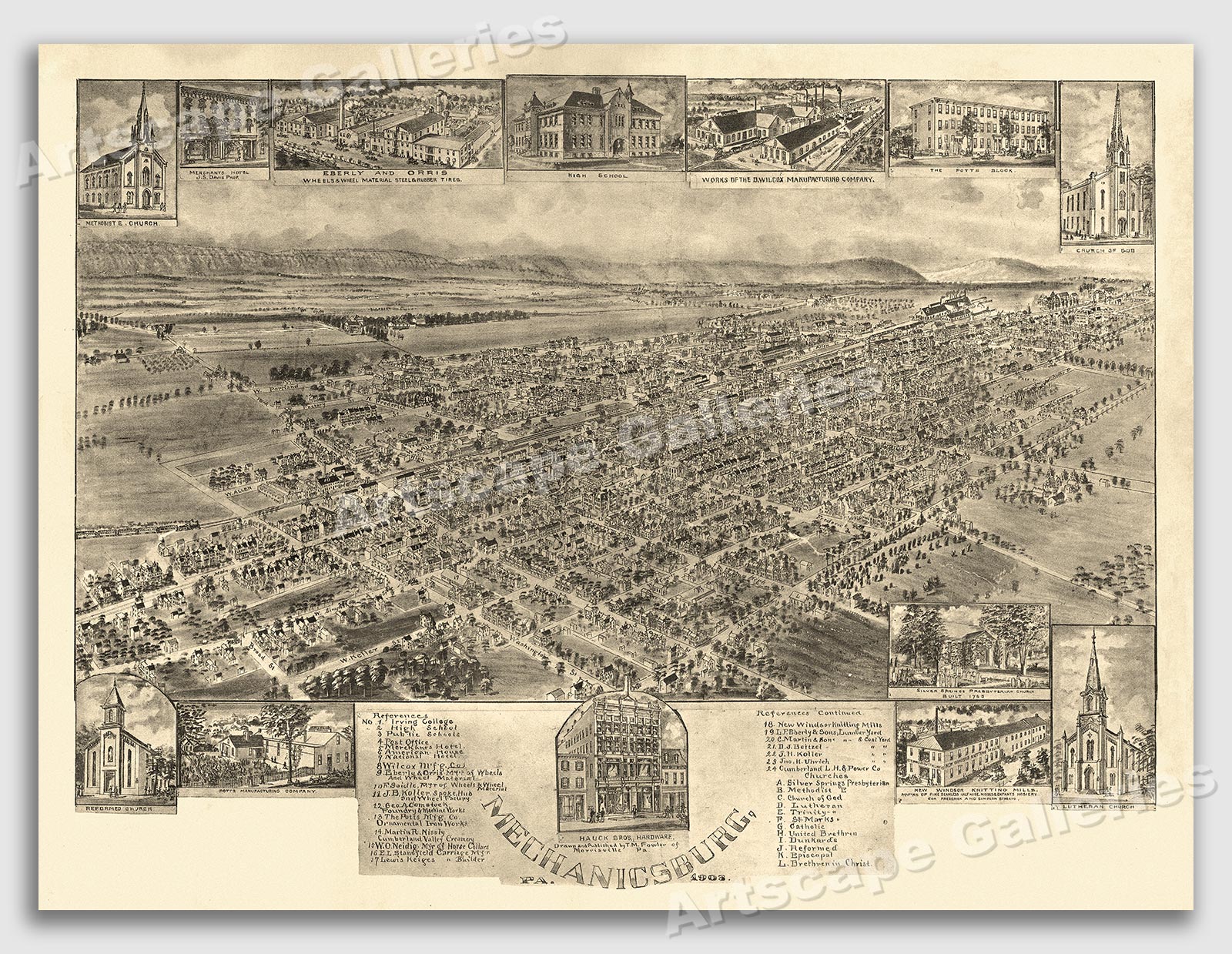 This great vintage style Panoramic City Map of Mechanicsburg, Pennsylvania shows a bird’s eye view as it looked in the early 20th century. Includes illustrations of the city as well as an index to buildings and points of interest.