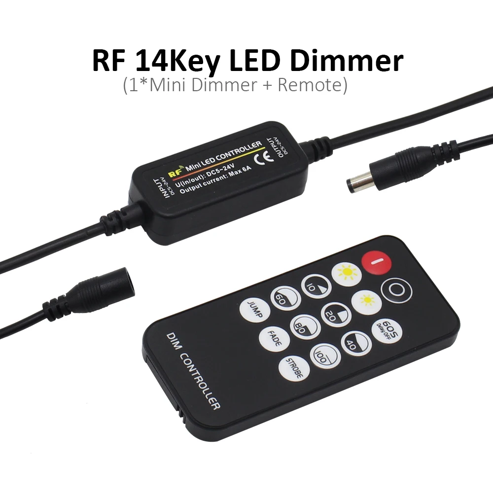 14Key RF Remote Light Control Dimmer Mini IR Controller for DC5V-24V Single Color LED Strip Light Adjust Brightness with DC Plug