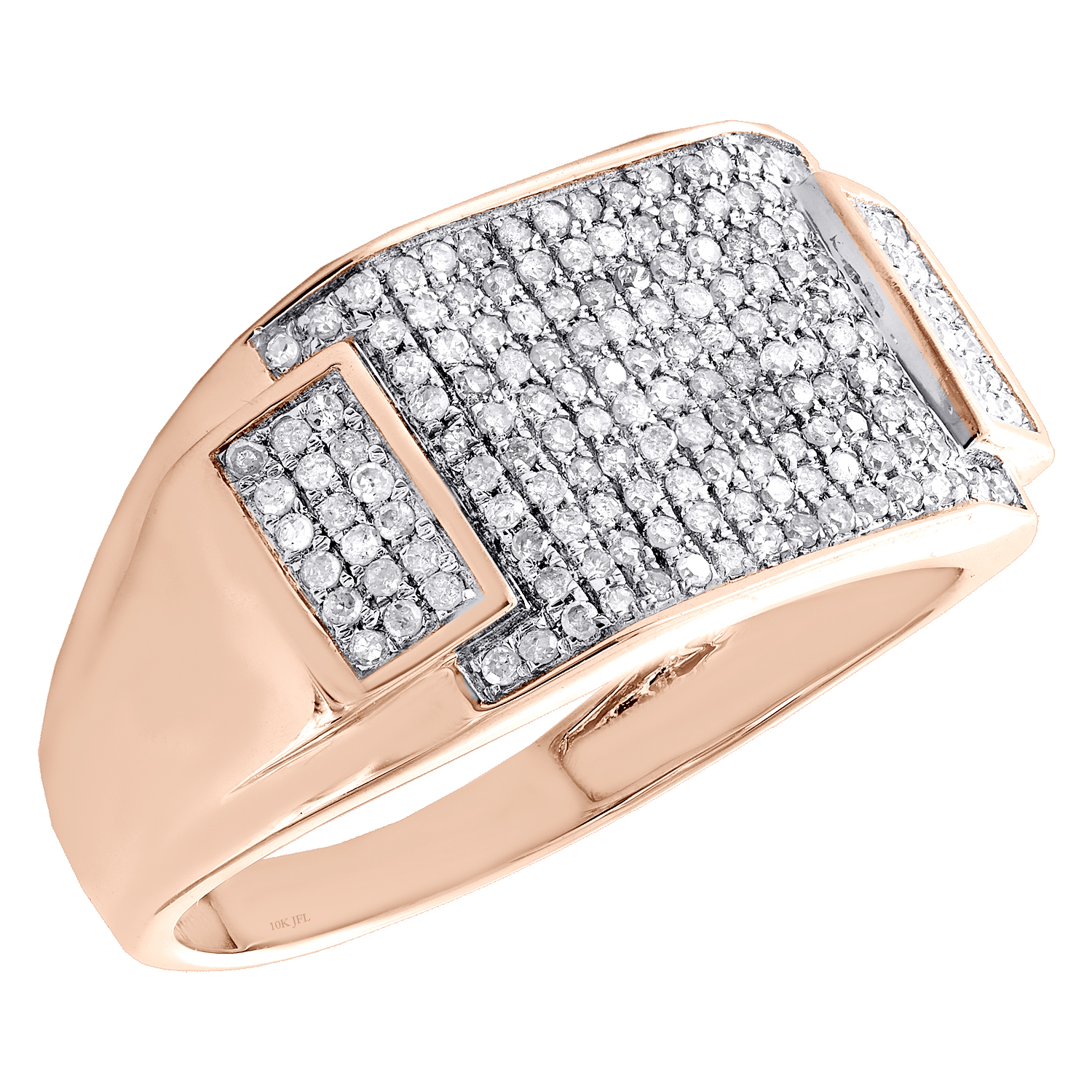 A bold and manly look, this sparkling diamond ring is just the perfect style for him. Brilliantly casted in 10K Rose Gold, this ring features sparkling diamonds set in 12mm wide frame. This ring design was intricately thought out so it can be worn for any occasion, no matter how casual or fancy. Rectangle frame with diamonds is the focal point of this fancy statement band, making a bold fashion statement. Make an impression with this exclusive ring captivating 1/2 ct. t.w. of genuine Round cut diamonds, with high polished to a lustrous shine. This ring weighs approx. 3.6 gr. All diamonds are 100% genuine and are matched to perfection. The diamonds are secured in Pave setting, making the overall appearance larger and lustrous. Available in size 10. If a different size is needed, please send us a message, sizing charges apply.