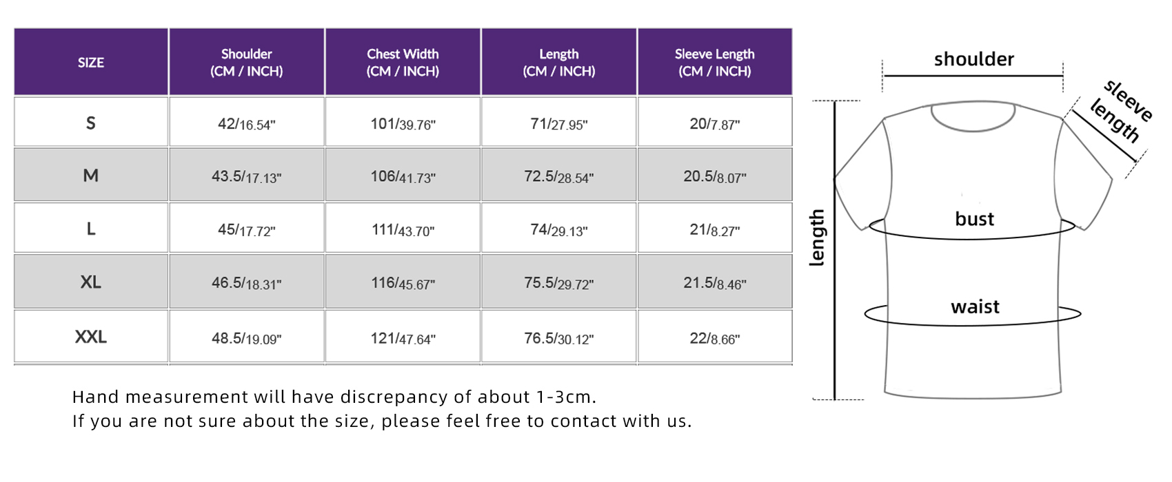 | size | Shoulder(cm) | Bust(cm) | Body Length(cm) | Sleeve(cm) |