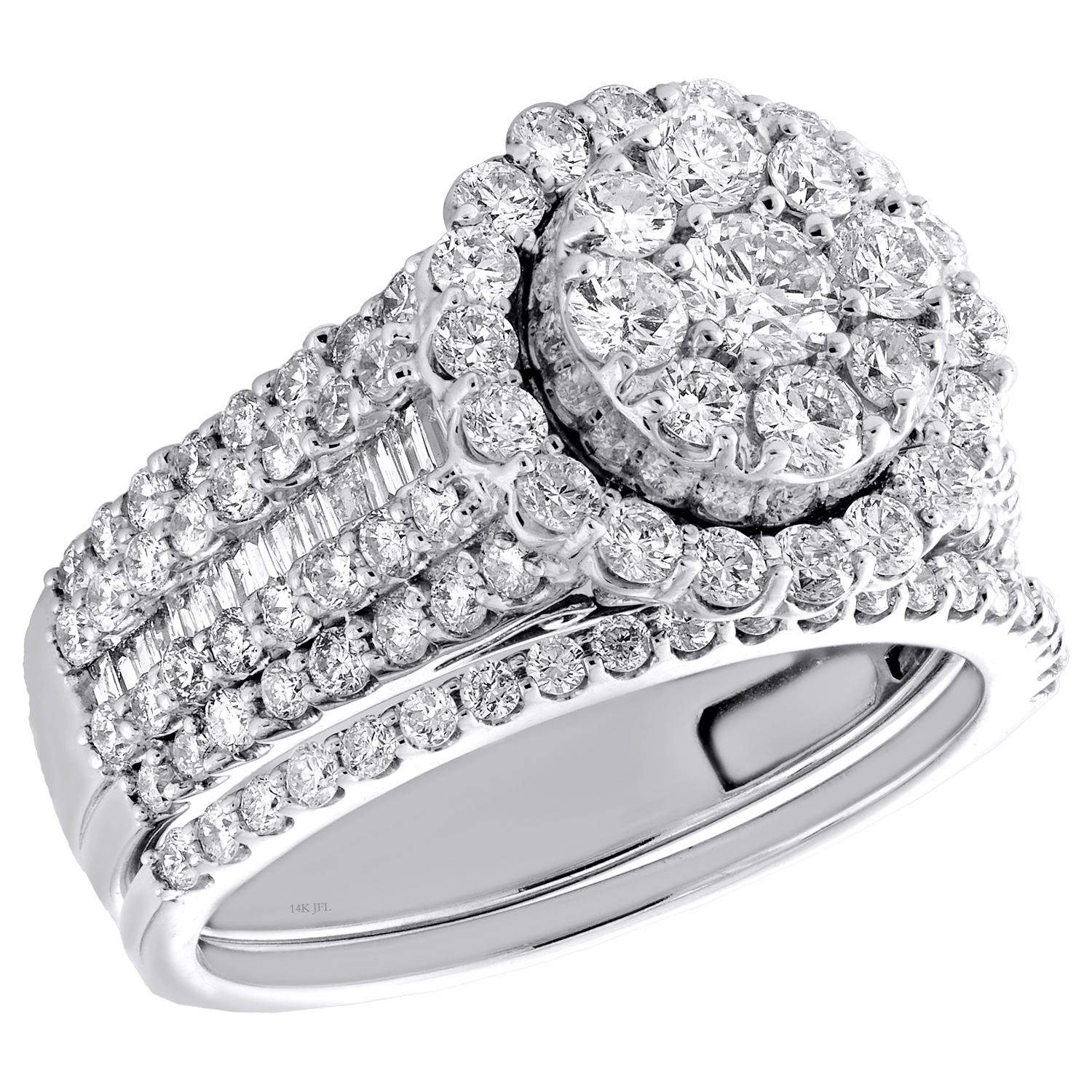 This beautiful two piece bridal wedding set is expertly crafted in 14K White Gold, showcases a cluster of round diamonds in the center with a circle halo around it. The sides of the engagement ring is beautifully adorned with rows of Round and Baguette diamonds leading to the center. The wedding band also has round diamonds to match the engagement ring. Radiant with 2 ct. t.w. of diamonds, this set is polished to a bright luster. Diamonds are set close together for a uniform and clean look in Prong and Invisible setting. This wedding set features a 12.25mm wide center setting. This set has a matching wedding band that fits around the engagement ring perfectly to complete the ensemble on your wedding day. The weight of this bridal set is approx. 7 gr.. Currently this bridal set is size 7. If you would like this ring in a different size please contact us, for resizing charges and we will get back to you right away. This ring can be sized at your local jeweler as well.