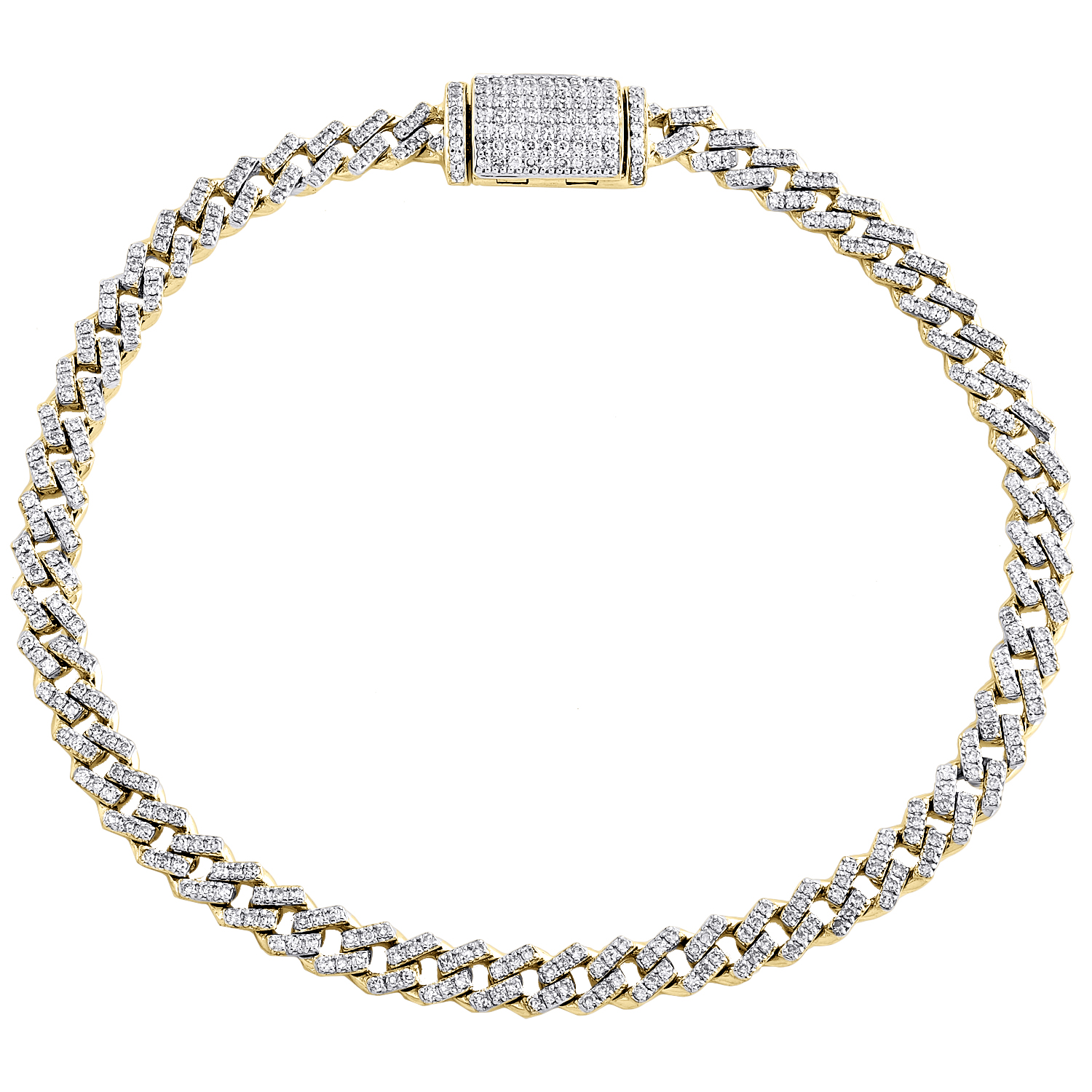 A new sophisticated and elegant look added to our diamond bracelet collection is this Miami Cuban Link Bracelet. Casted in solid 10K Yellow Gold and genuine diamonds. Well built, this bracelet has sturdy frame for durability for a comfort fit. All diamonds are set in Prong setting, making the overall appearance larger and lustrous. This statement piece will make a great addition to your jewelry collection. Radiant with 1.75 ct. t.w. of natural White diamonds, this bracelet is high polished to a lustrous bright shine. All Round cut diamonds in this bracelet are equivalent in color and clarity, giving this bracelet a comparable shine and luster throughout. This bracelet has fancy Diamond Box Clasp for secure wear. This Miami Cuban Link Bracelet measures 5mm wide at its widest point and weighs 11 gr.