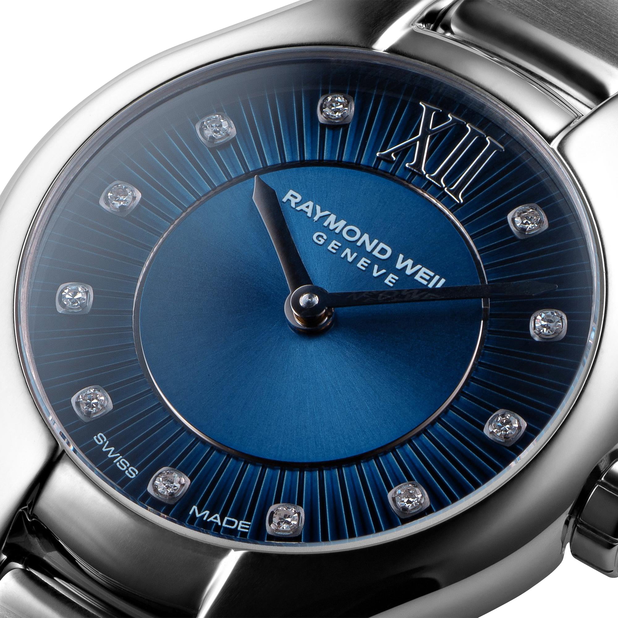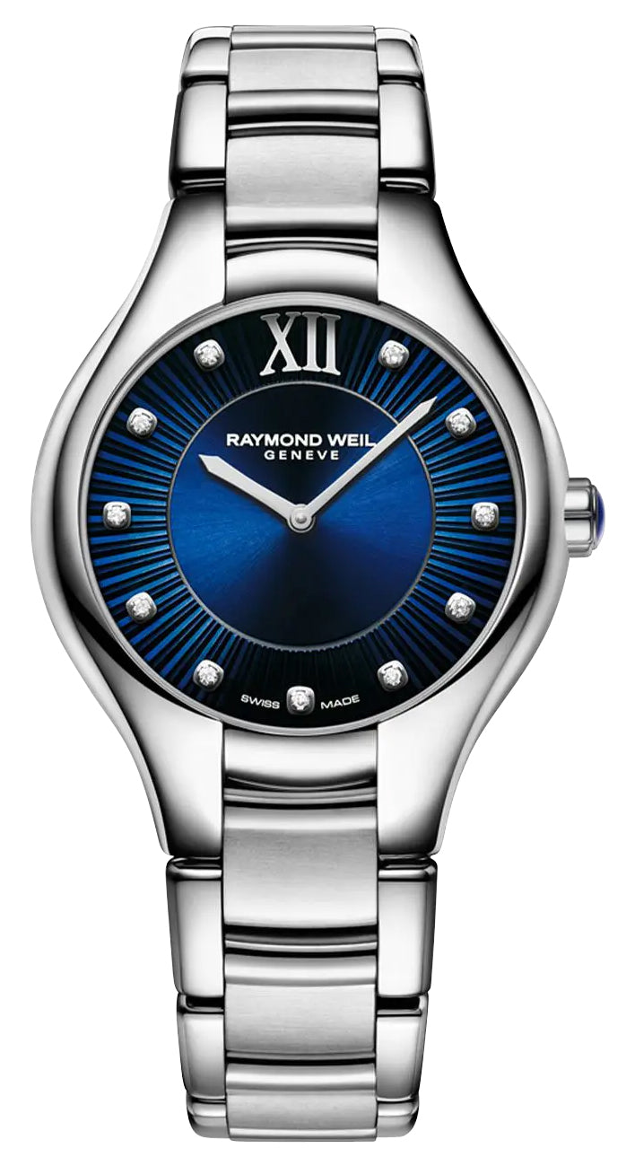 Like all of our watches, this Raymond Weil Noemia Stainless Steel Blue Dial Diamonds Quartz Womens Watch is brand new and comes in its original packaging.