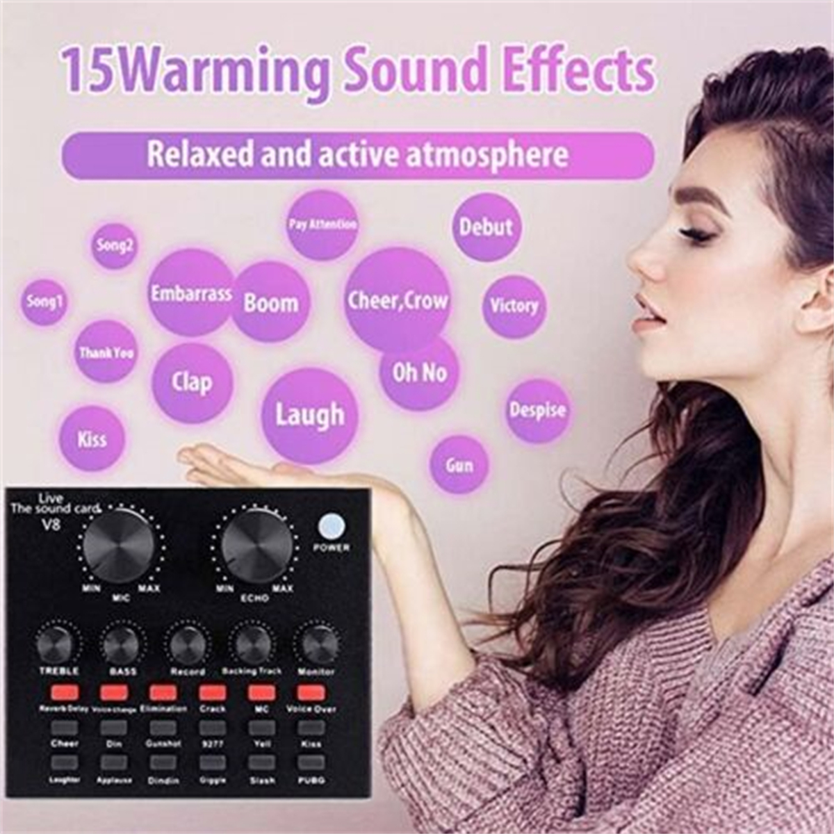 -The sound card includes 65 sound effects, 8 fun modes and 6 adjusting rotary knobs.