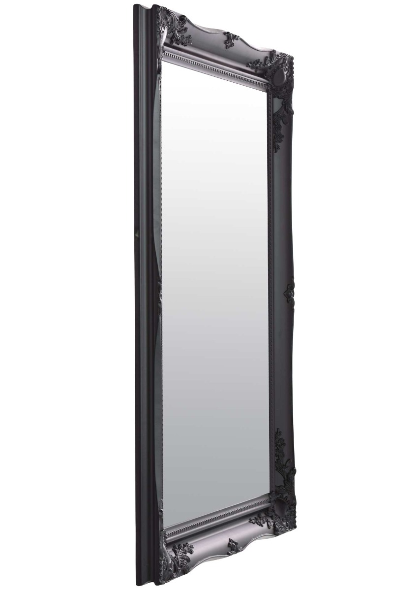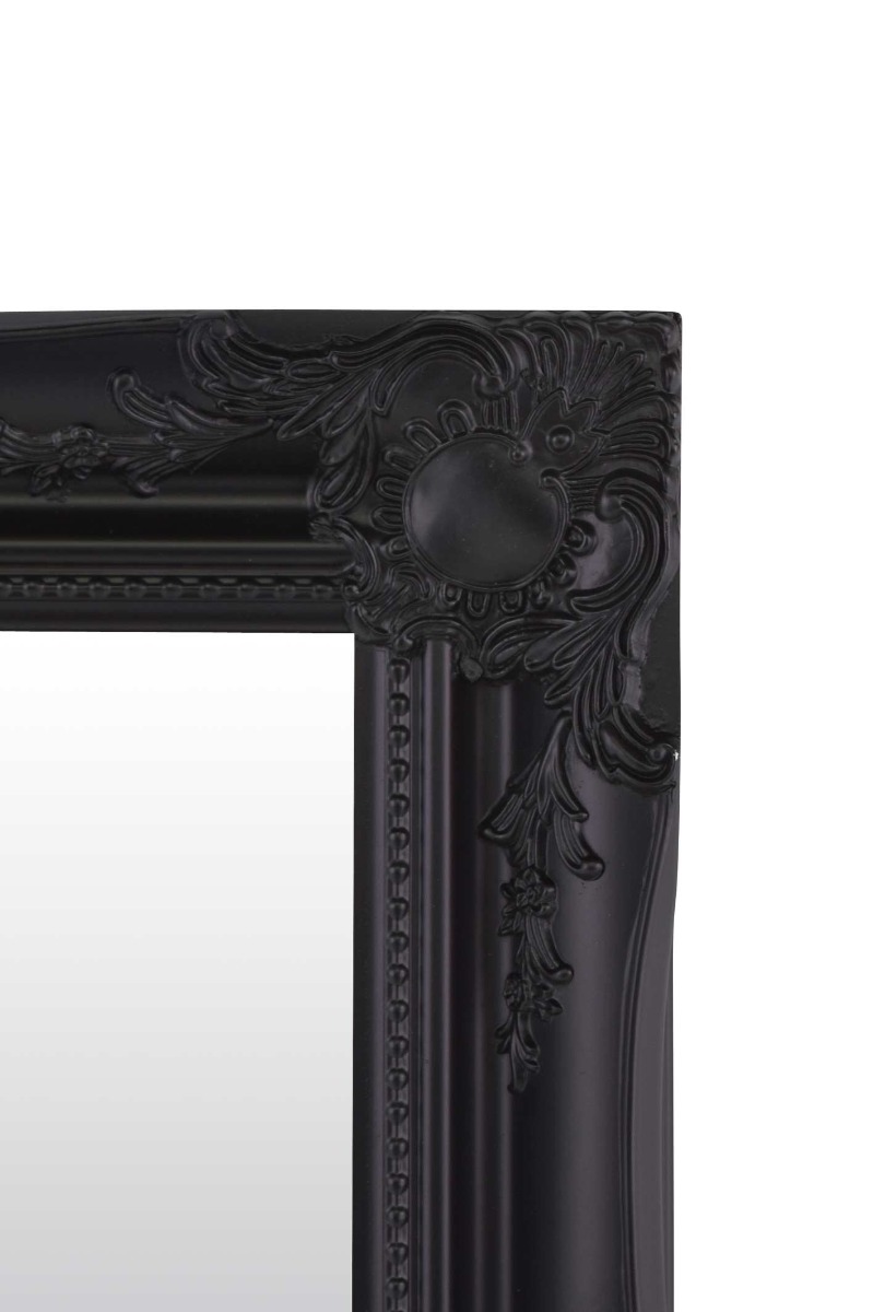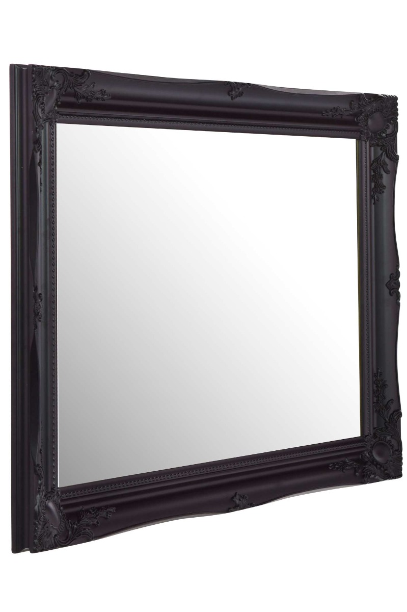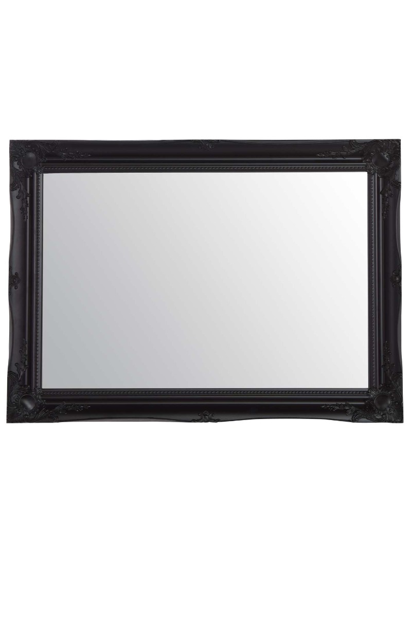 A classic black hand finished French style mirror. The design boasts ornate detailing from all four corners and sides. This mirror has a glass size of 2ft 6 x 1ft 8 76cm x 51cm and an overall size of 3ft x 2ft 2 91cm x 66cm.We stock this frame in 5 different colours white gold silver black and ivory and 11 different sizes. Search mfixings for standard heavy duty fixings, swfixings for solid wall fixings, pmfixings for plasterboard fixings and lmfixings for lockable mirror fixings.