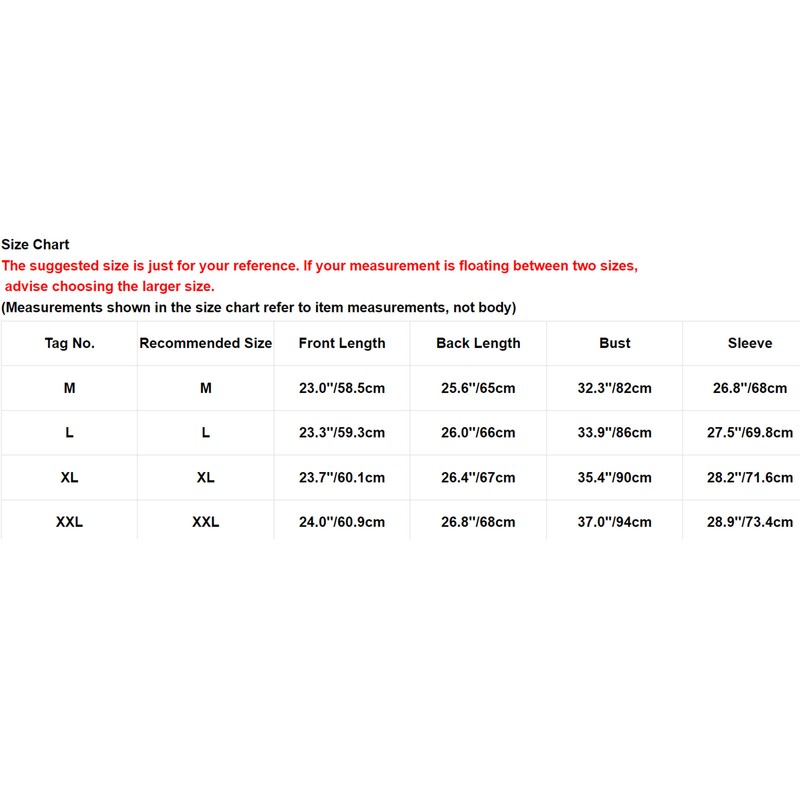 | Tag No. | Recommended Size | Front Length | Back Length | Bust | Sleeve |