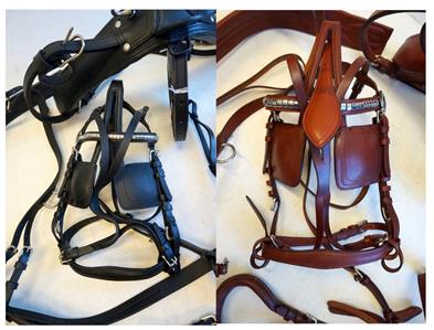 - COMPLETE SET LESS THE BIT- BREACHING & LOIN STRAP, BREASTPLATE & NECK PIECE, GIRTH & SADDLE, BRIDLE & BLINDERS, TRACES & REINS & CRUPPER WITH BACK STRAP.