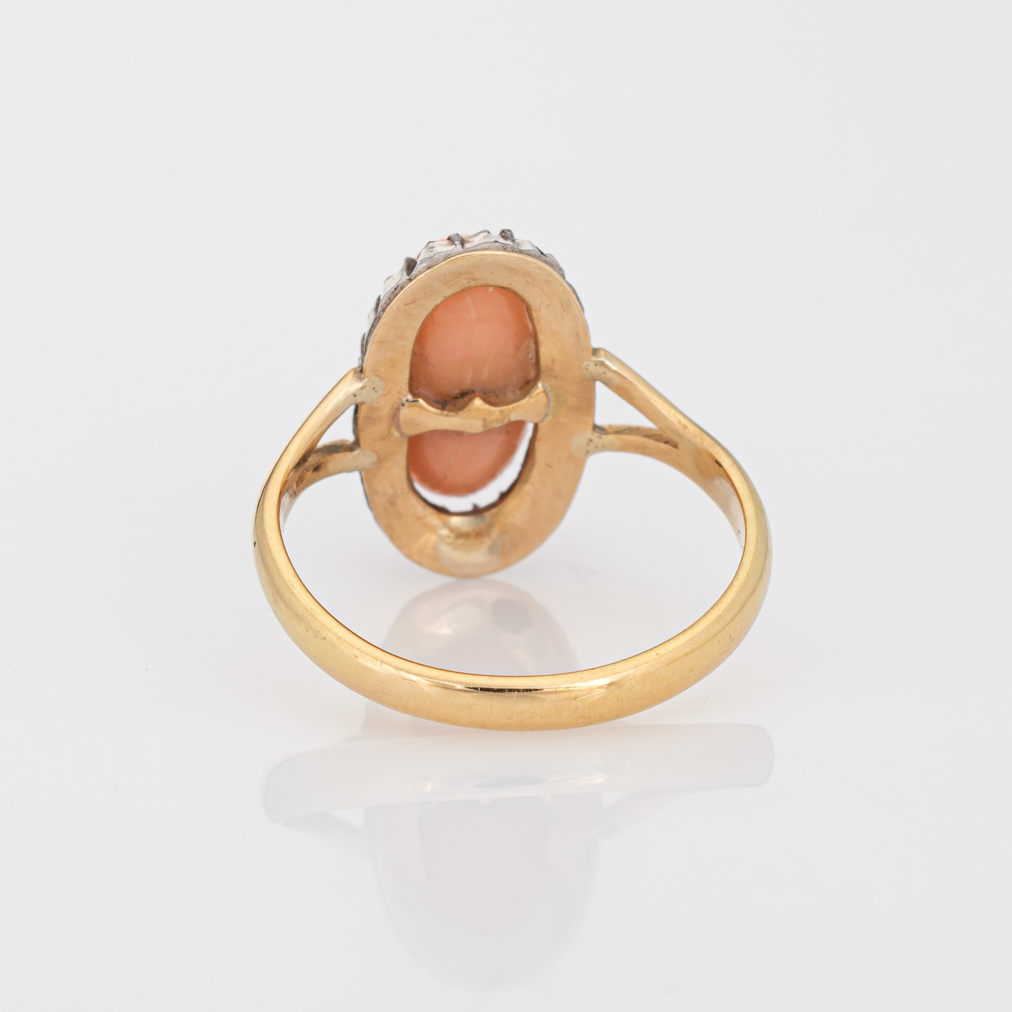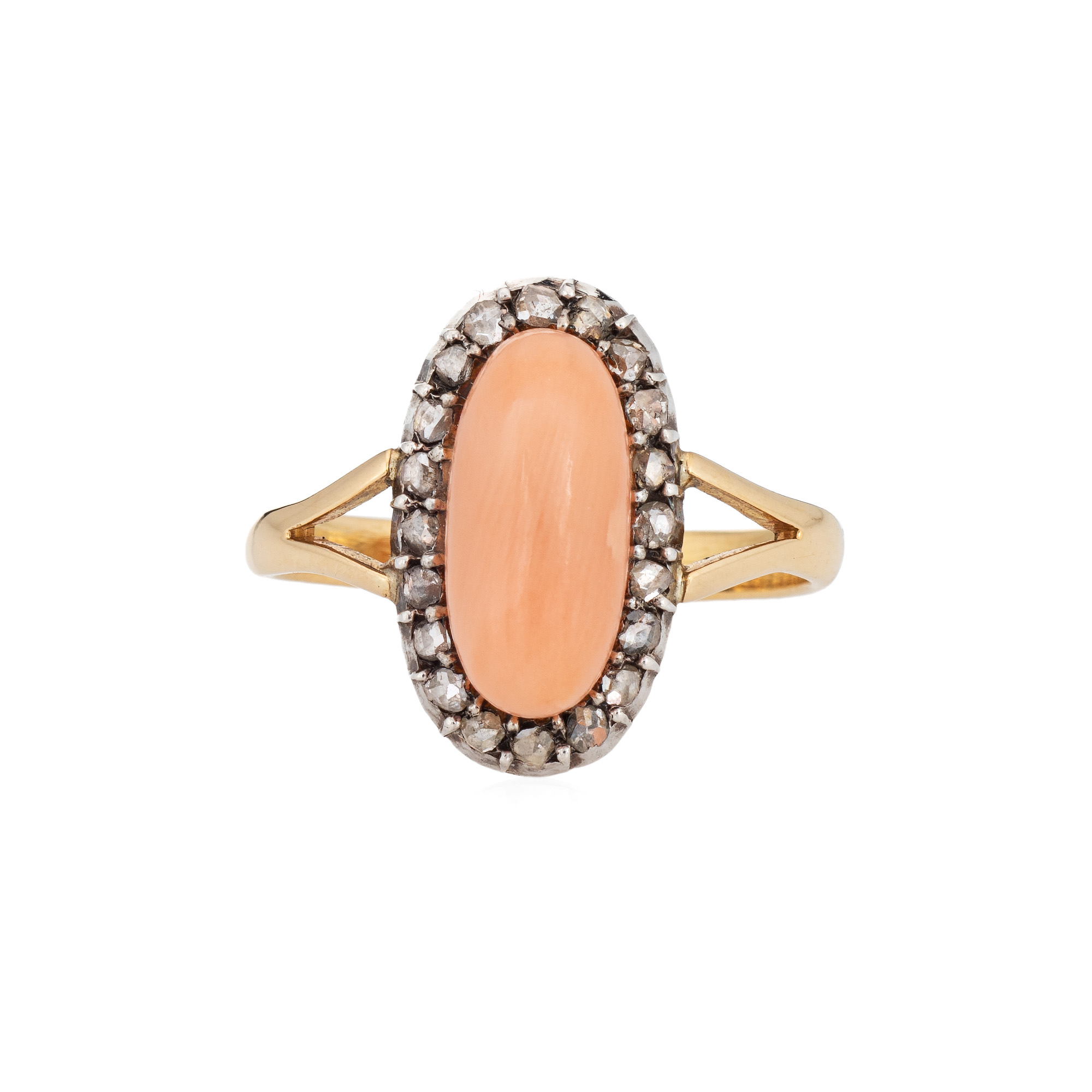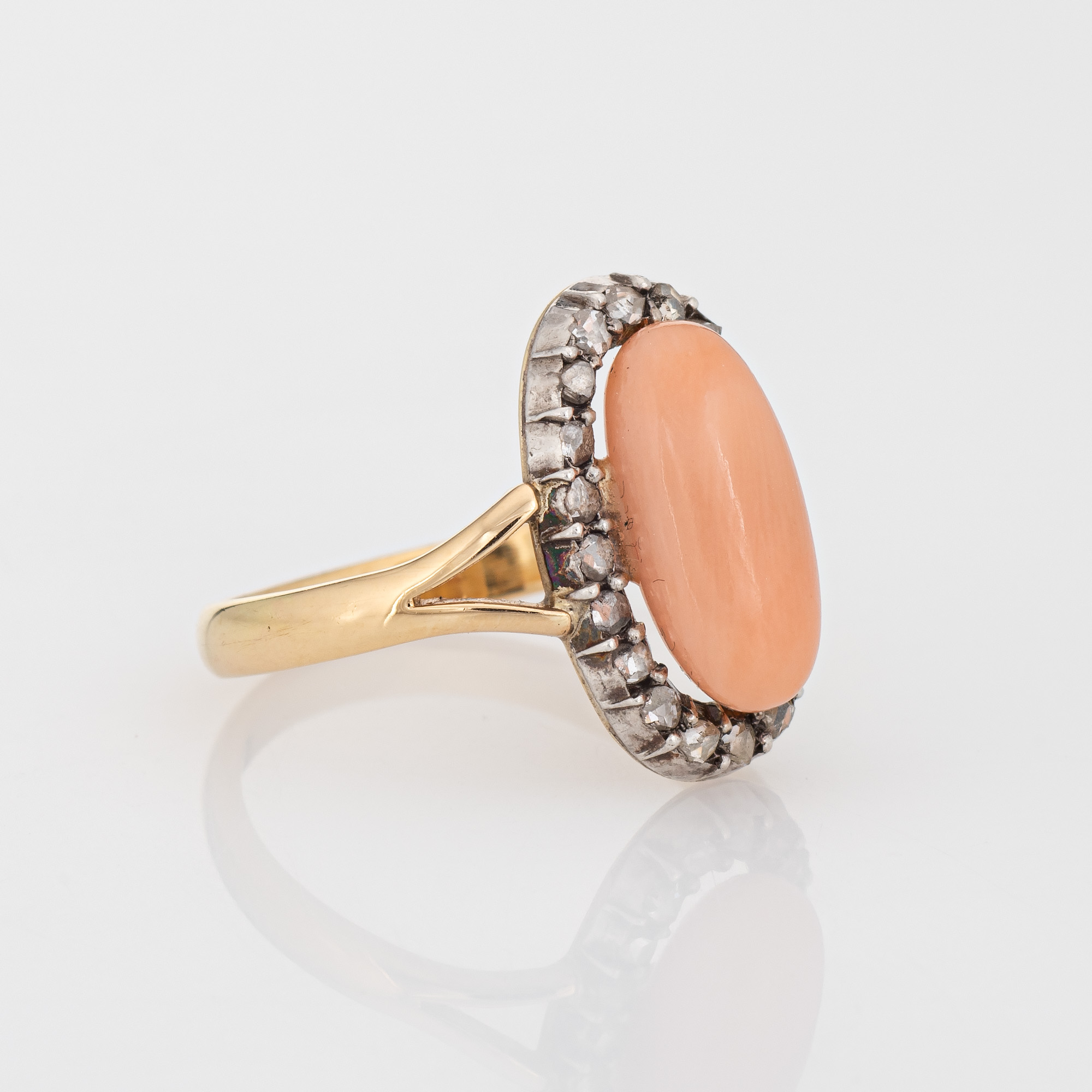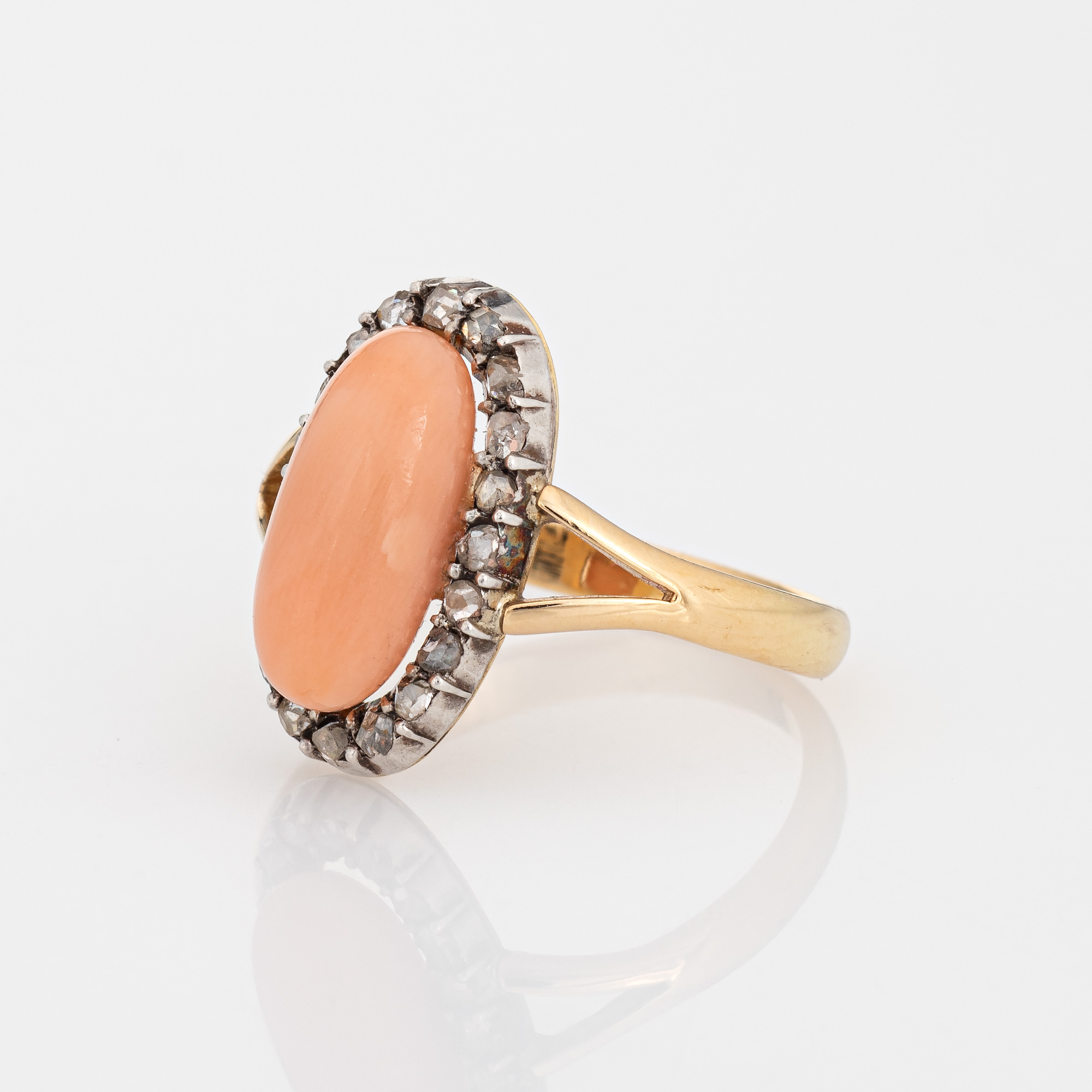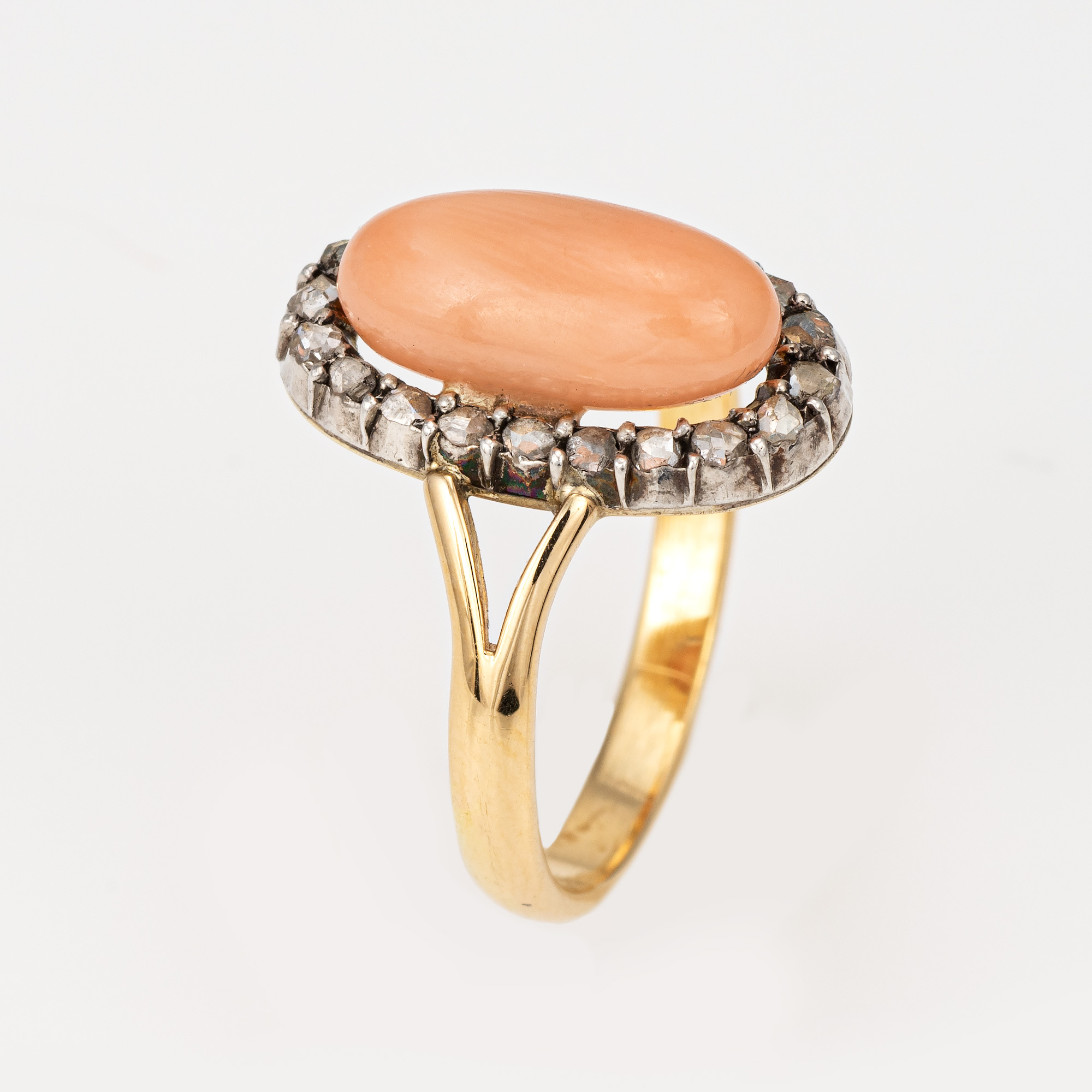 Stylish antique Victorian angel skin coral & diamond ring (circa 1880s to 1900s) crafted in 18 karat yellow gold.