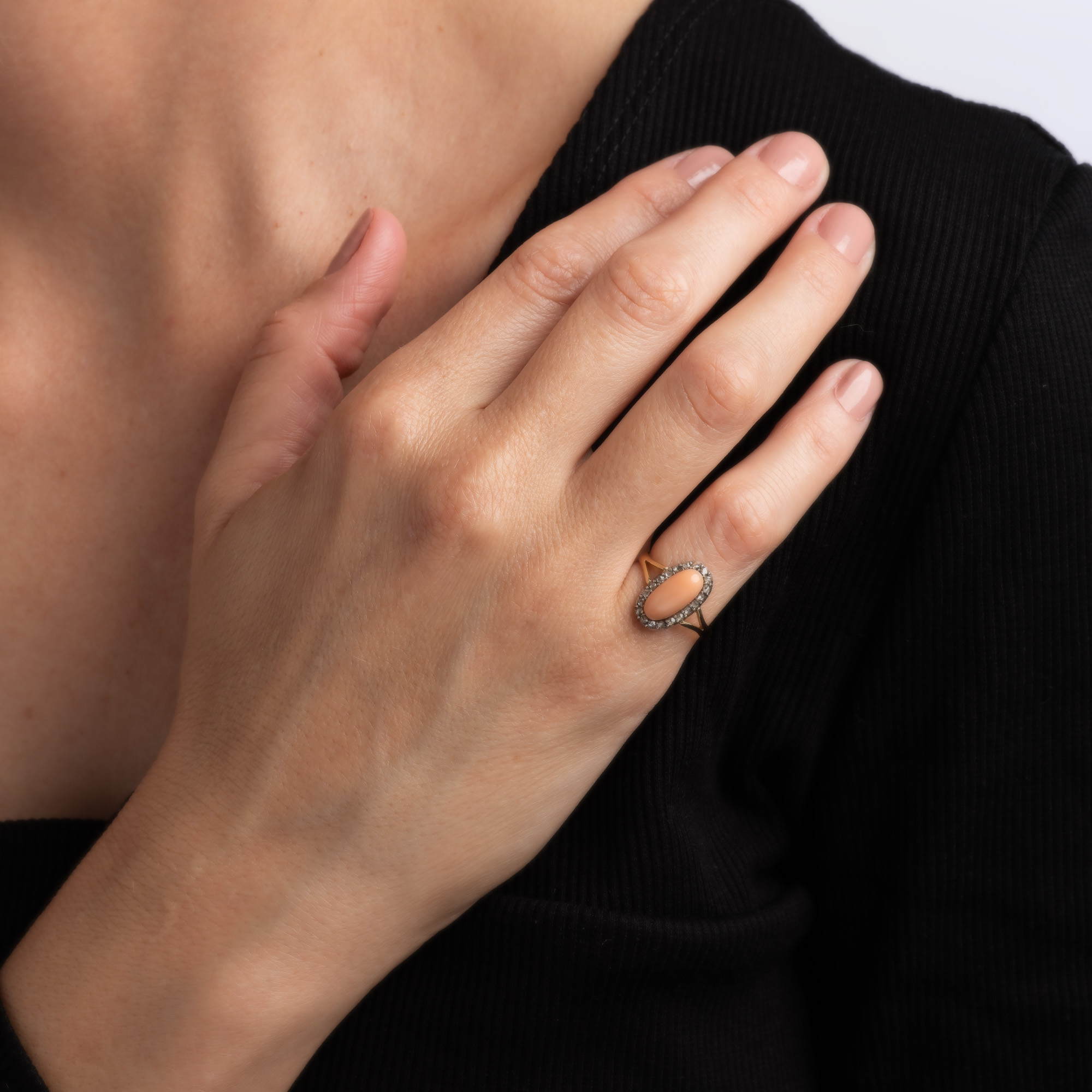 The light peach coral is set in a small oval shaped mount, accented with old rose cut diamonds. The cocktail ring makes a nice statement on the hand and is great for day to day wear. The medium rise ring (6mm - 0.23 inches) sits comfortably on the finger.