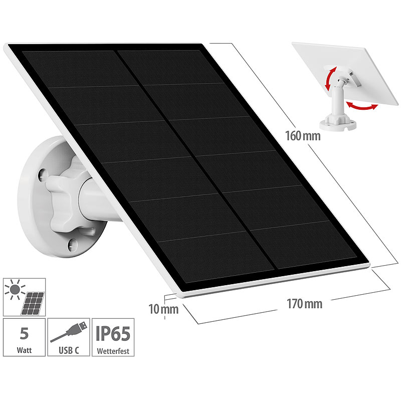 - Solarpanel inklusive 3 m USB-Kabel, Halterung, Montagematerial und deutscher Anleitung