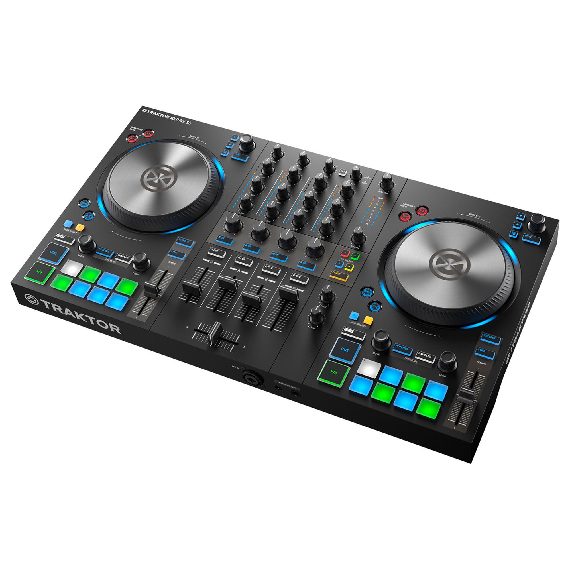 The Native Instruments TRAKTOR KONTROL S3 is designed for DJs and electronic music performers that use TRAKTOR PRO 3 software. The controller features large jog wheels with modes of operation: Turntable, Jog, and Beatgrid. An RGB LED ring surrounds each jog wheel to visualize deck rotation in jog and turntable modes, track tempo, and deck selection (A and B in blue, C and D in orange).