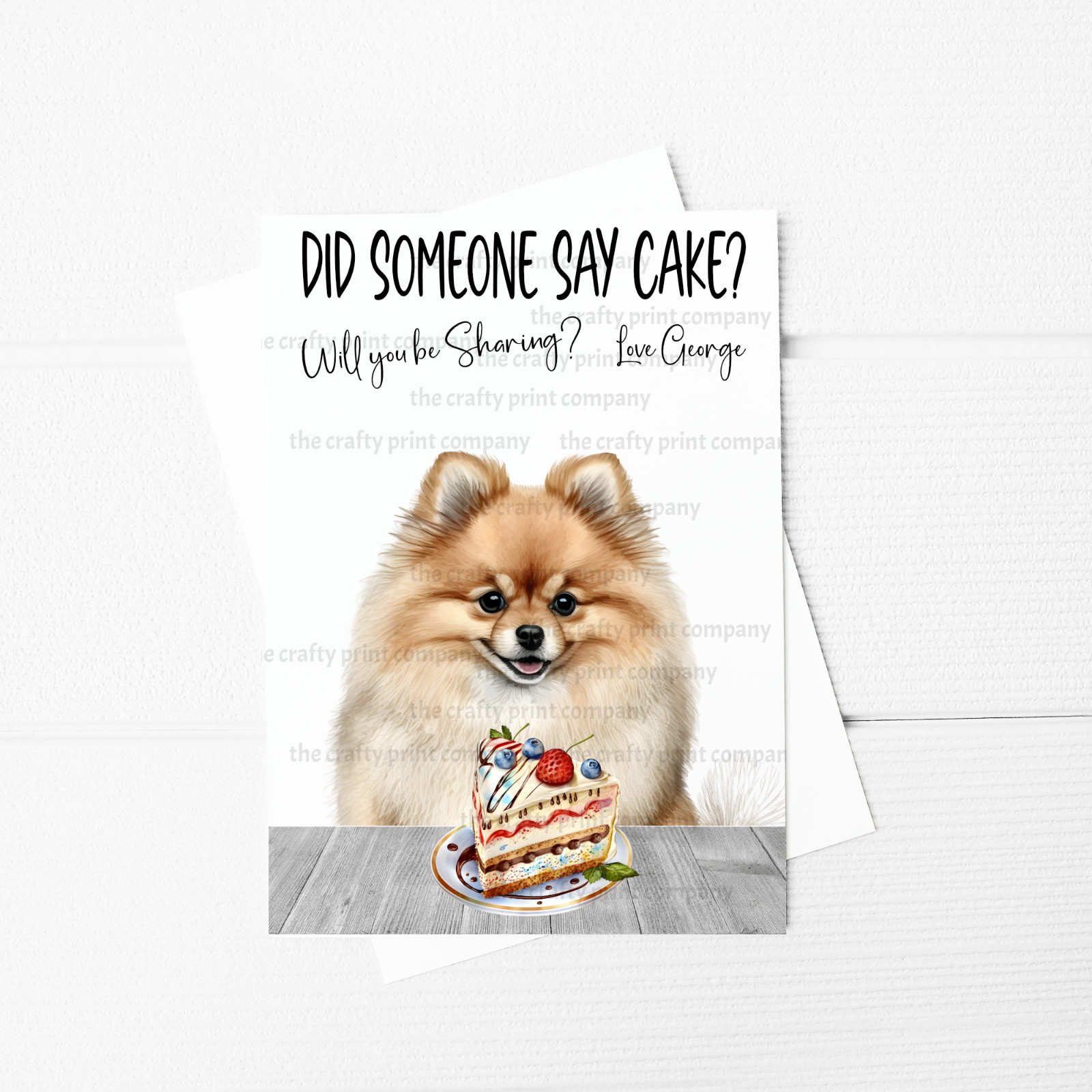 Did someone say cake? personalised A5 Greeting Card with a Pomeranian with Birthday Cake design on it