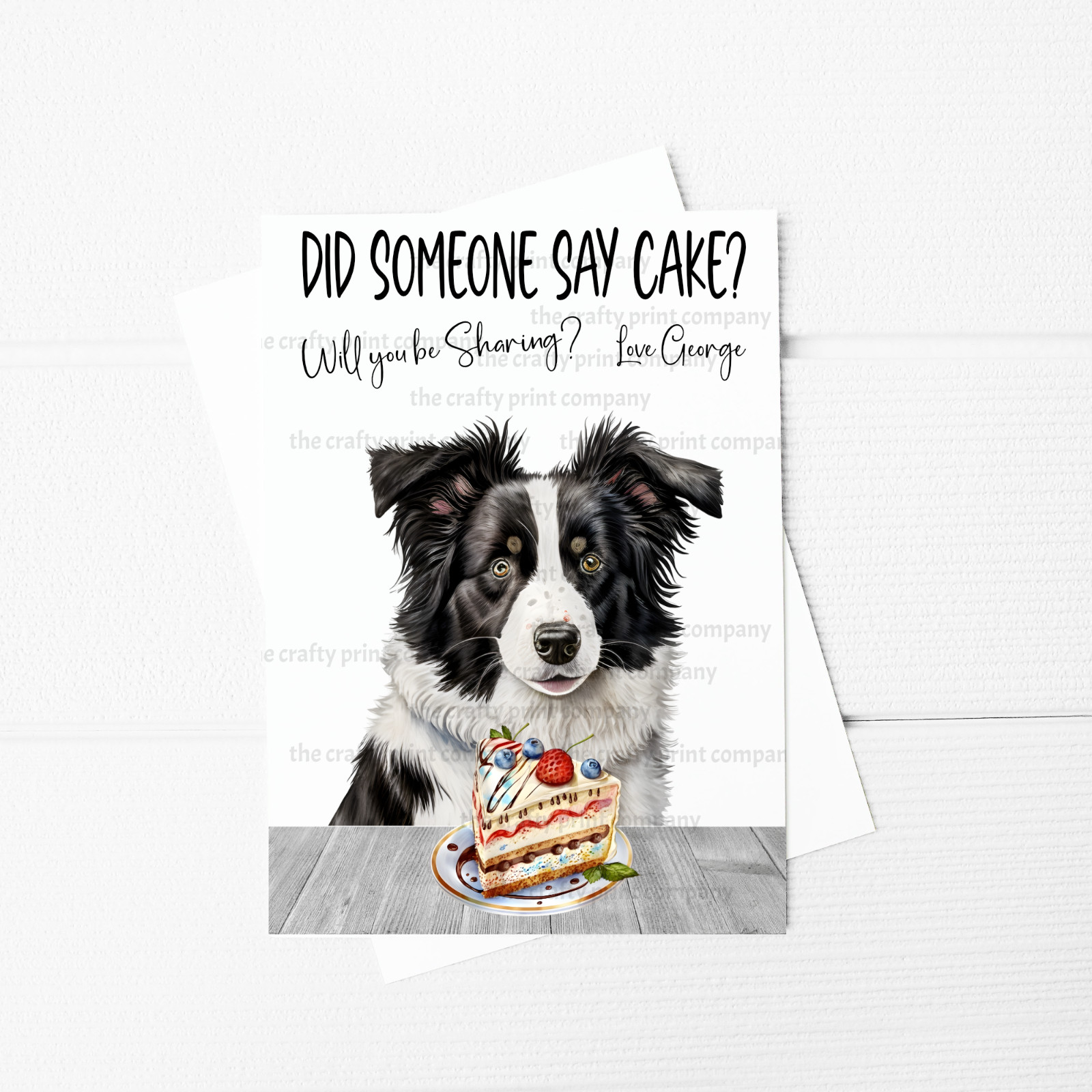 Did someone say cake? personalised A5 Greeting Card with a Collie with Birthday Cake design on it