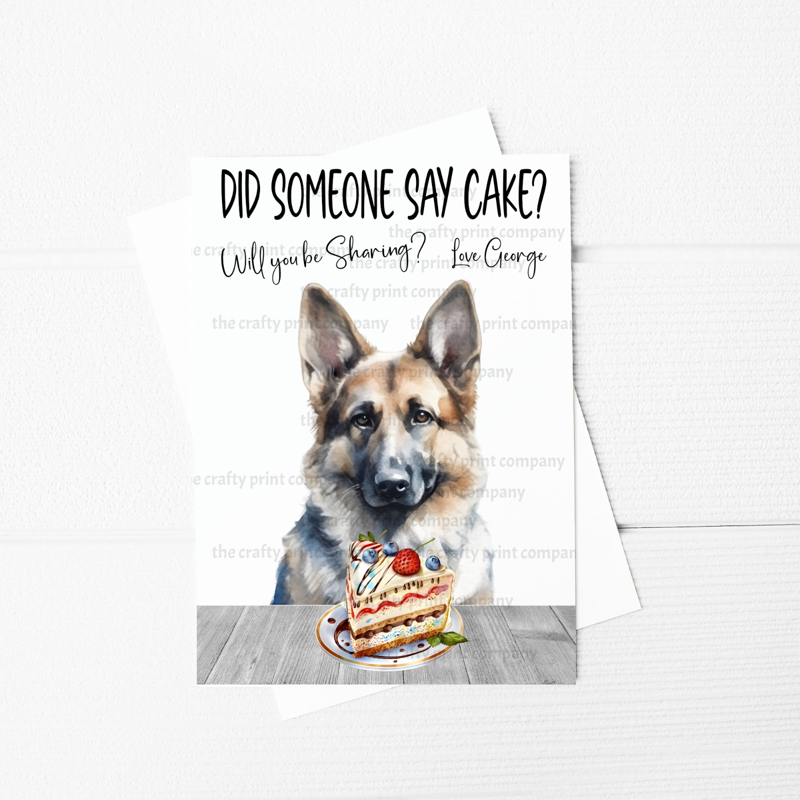 Did someone say cake? personalised A5 Greeting Card with a German Shepherd with Birthday Cake design on it