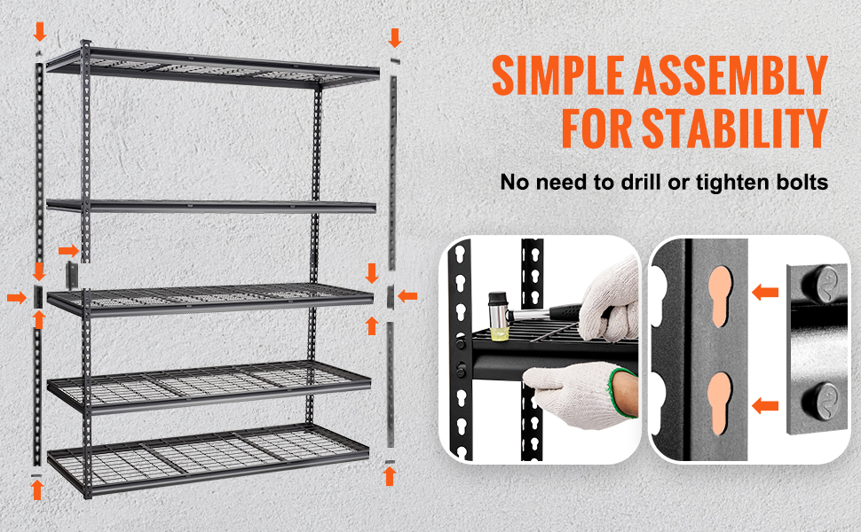 Setup? A Piece of Cake: It is a breeze to set up this metal shelf, and non-professionals can also complete it in a few minutes. Leave your toolbox in the drawer. With our press-to-assemble design, your only assembly buddies are a rubber hammer and gloves – included, of course!