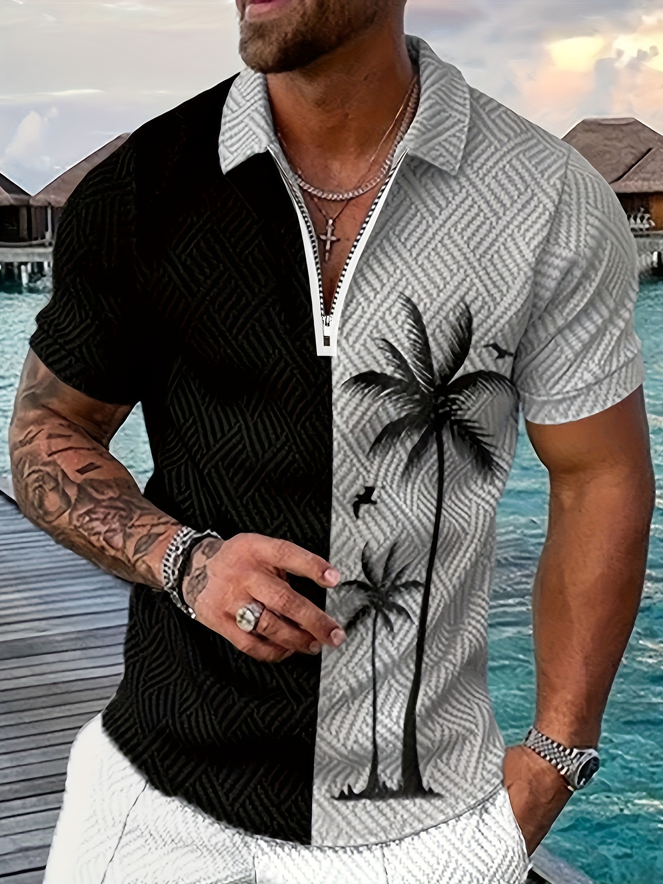 Polo T Shirt Zipper Collar Black Gray Contrast Coconut Palm Tree Zip Golf Sports