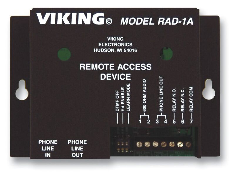 The RAD-1A, remote access device, gives authorized users remote access to one way paging amplifiers, digital announcers and other audio programs. A programmable access code prohibits access by unauthorized users. |