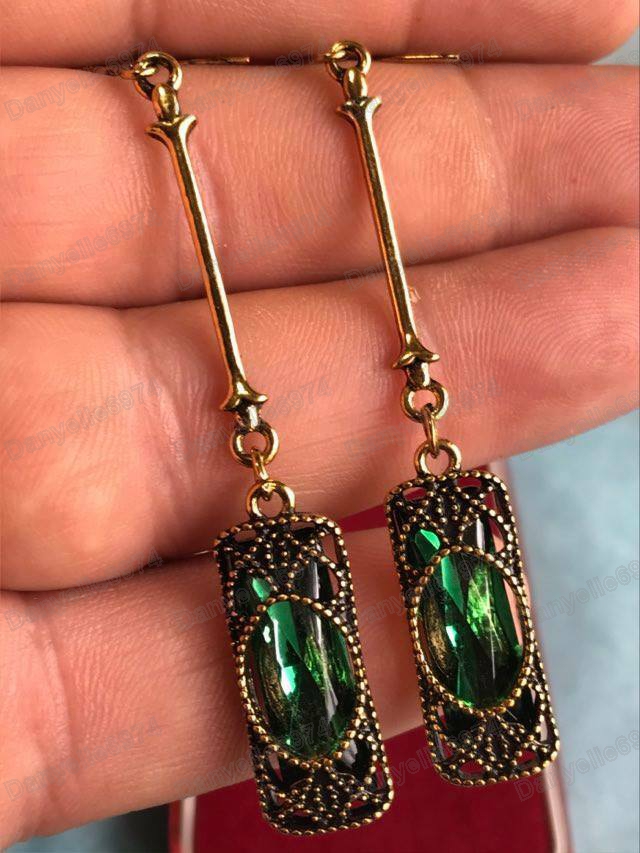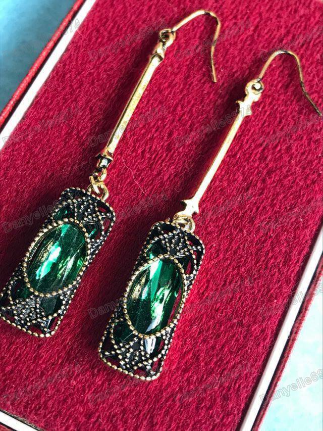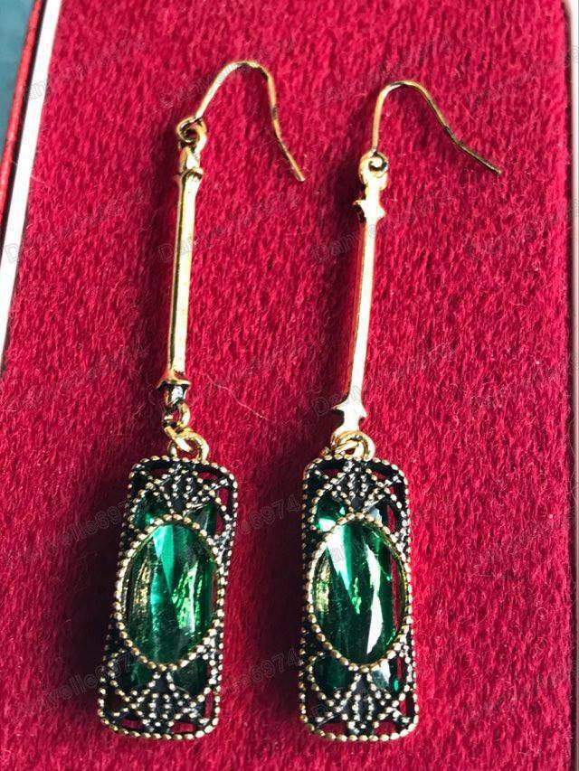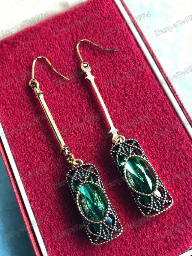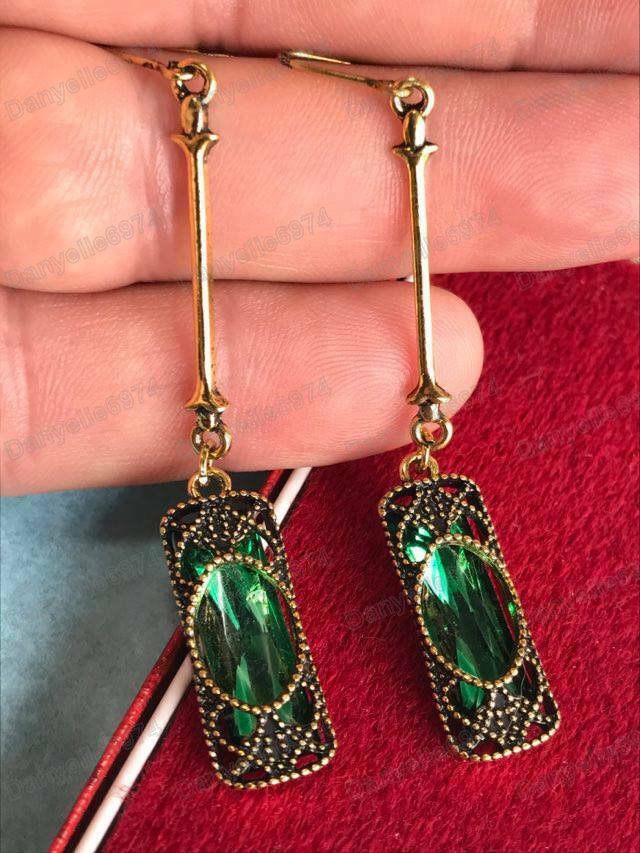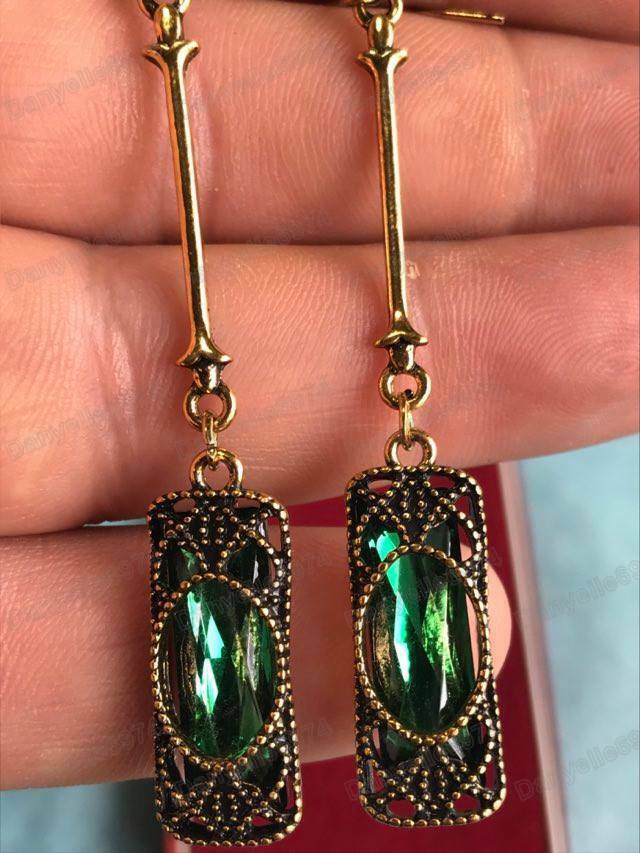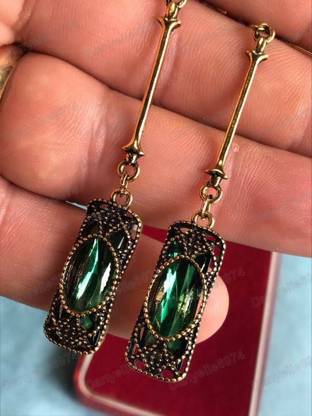Long earrings with green glass crystals set in antique gold coloured metal, with filigree detail.