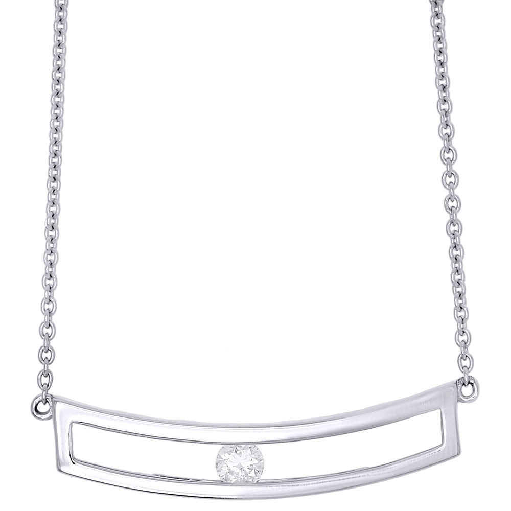This beautiful sliding diamond bar pendant is crafted in 14K white gold and shimmering round cut solitaire diamond, ensuring sparkle from every angle. Radiant with 0.10 ct. total weight of genuine diamond, this necklace is polished to a brilliant shine. The bar measures one inch and is secured by cable chains at either end. This necklace has a well built frame, weighing at approximately 3.1 grams of gold. The round diamond is securely held between the gold mounting in moving channel setting. The necklace hangs at 15.75 inches in length and is secured by a spring ring clasp.