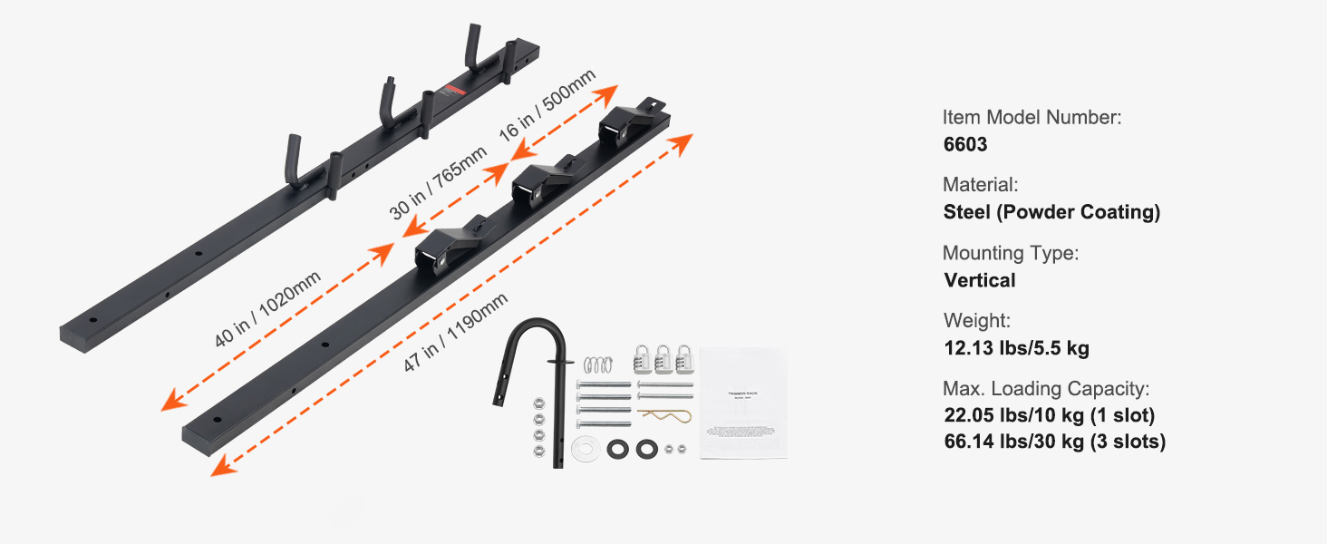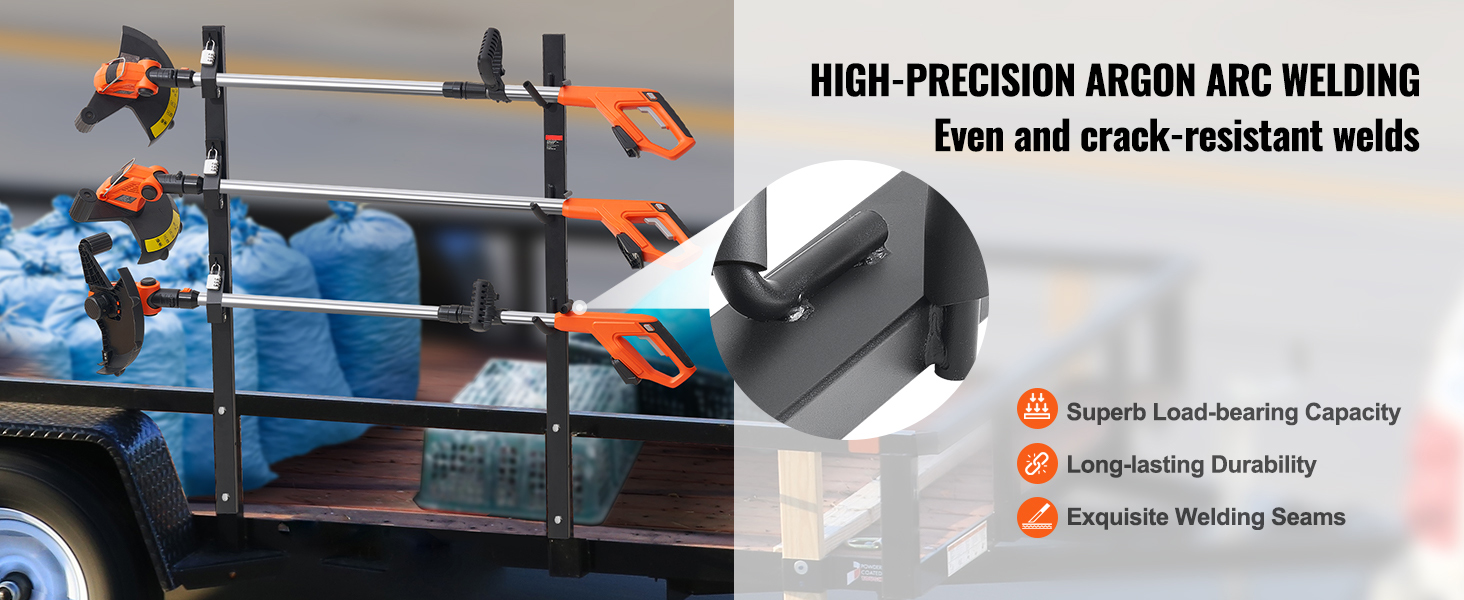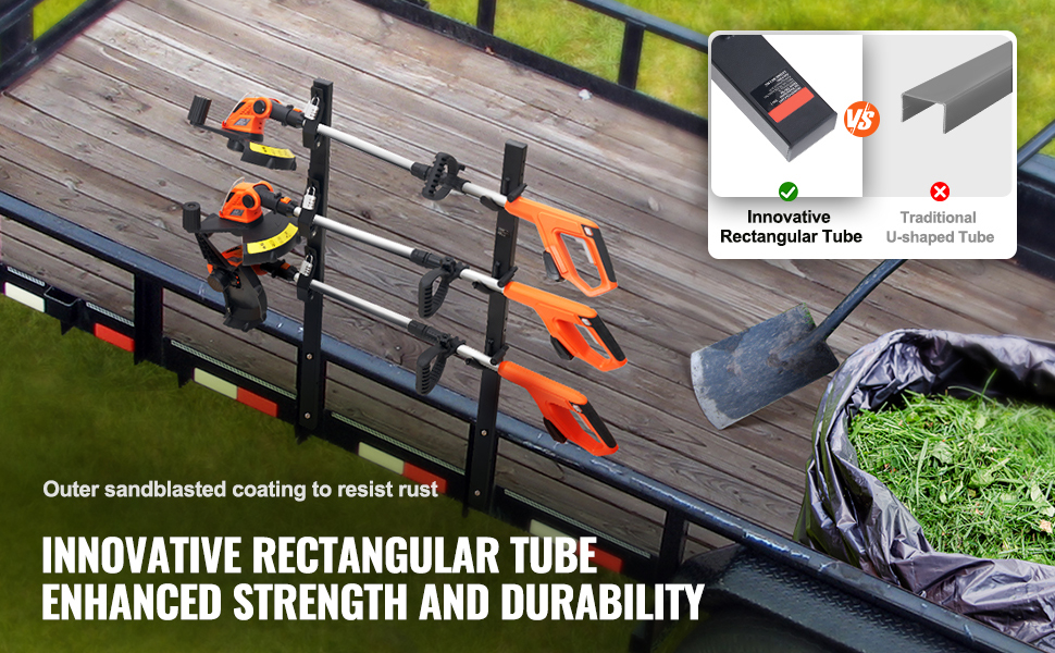Built to Last: Our trimmer trailer rack features innovative rectangular tubes that provide superior durability and strength compared to traditional U-shaped designs. The rectangular structure distributes and withstands forces, while the outer powder spraying process protects against damp corrosion, ensuring long-lasting performance and preventing rust.