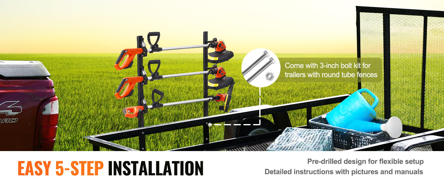 Effortless Installation: Worried about installation? Don't be! Our trimmer rack for trailers comes with clear step-by-step instructions, pictures, and video guides, making setting up a breeze. The 3-inch long bolt kit ensures a stable and secure attachment to circular tube fence trailers.