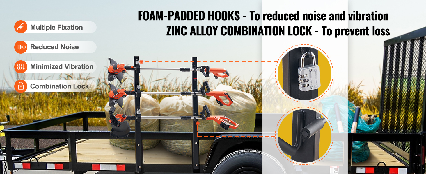 Secure Multiple Fixation: Our 3-place trimmer racks feature fully foam-wrapped hooks for added protection, shock absorption, and noise reduction. This design prevents the suspended weight from slipping off during transport. The zinc alloy password lock effectively secures your machines and reduces worries about shaking or misplaced keys.
