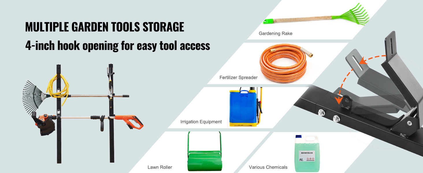 Multi-Purpose Rack: The trimmer rack's hook can be opened up to 4 inches, allowing easy access and placement for your trimmer. Not just limited to trimmers, this versatile locking rack can also accommodate other garden equipment such as rakes, lawn rollers, irrigation tools, fertilizer applicators, and various pesticides, making it the perfect all-purpose garden equipment storage solution.