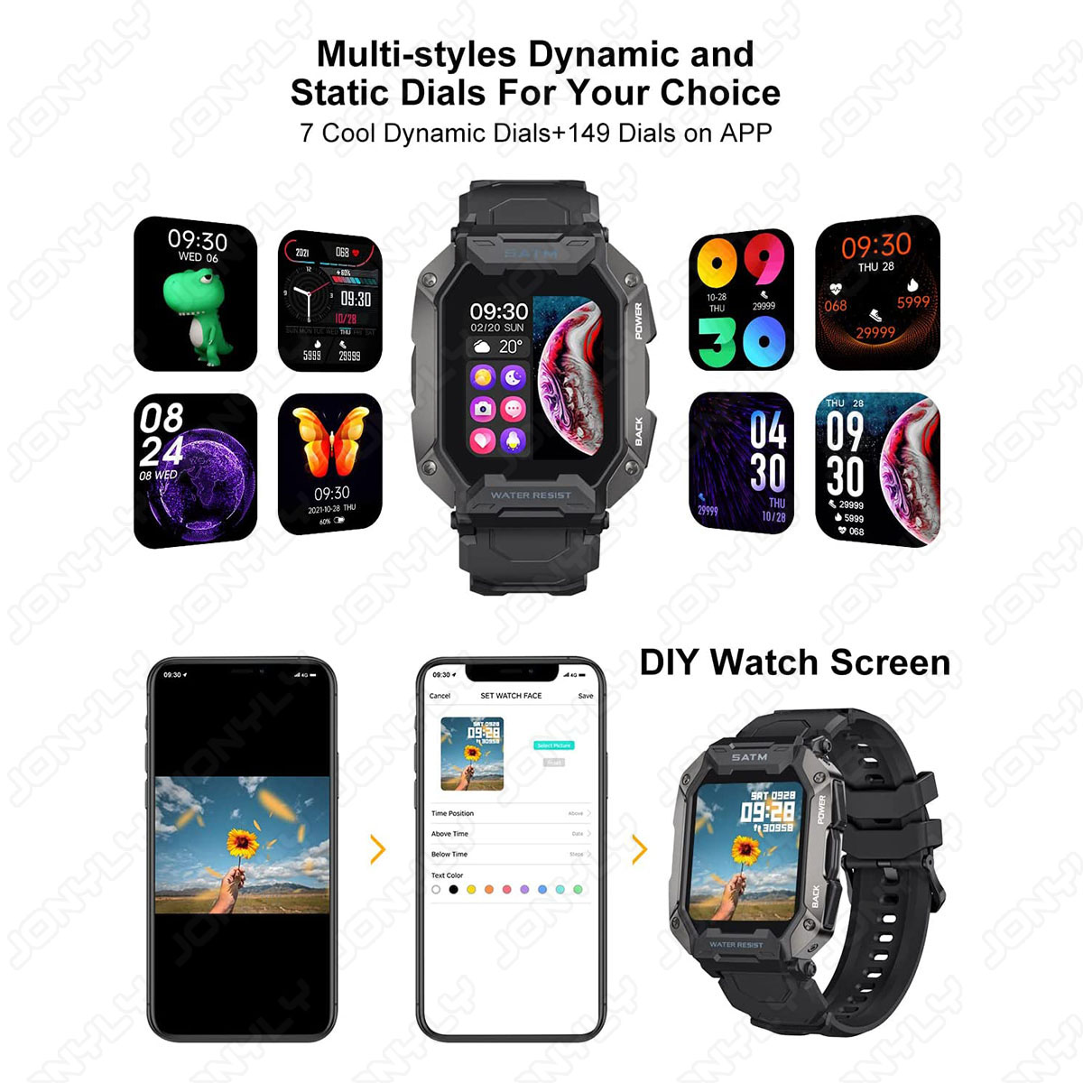 Connect mobile phone APP via Bluetooth, provide health monitoring (heart rate, blood oxygen, sleep, sedentary reminder, drinking water reminder, etc.), exercise record (24 exercise record data can be selected), mobile phone message notification, caller ID, weather check (obtain data from mobile phone), alarm clock (three can be set), remote control photography, etc. For more detailed functions, please refer to the product manual.