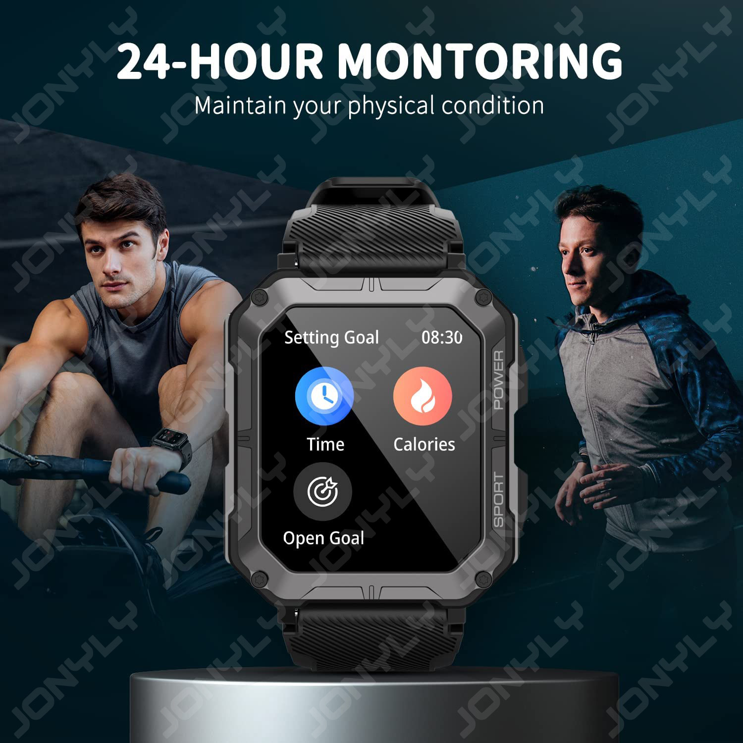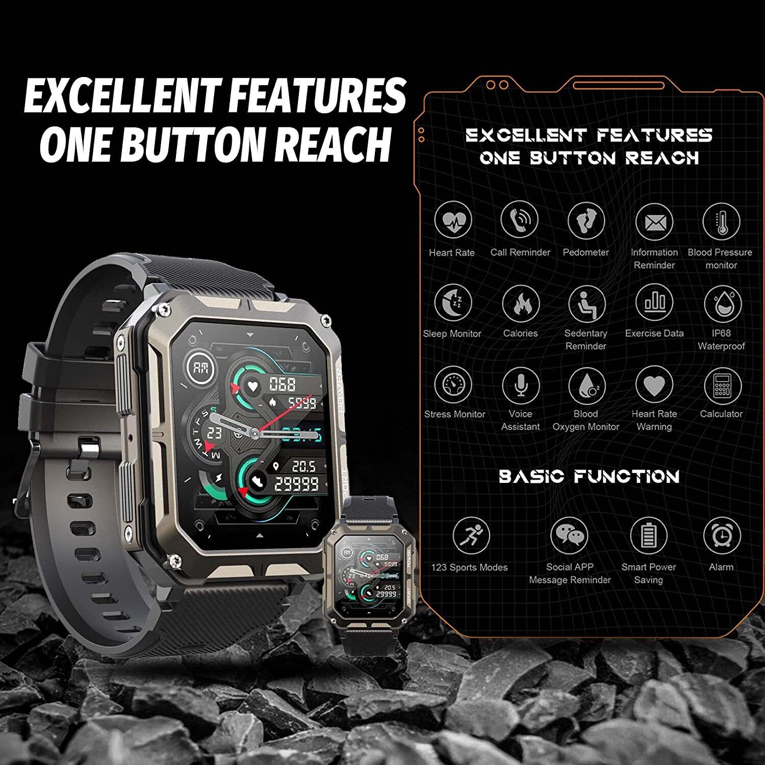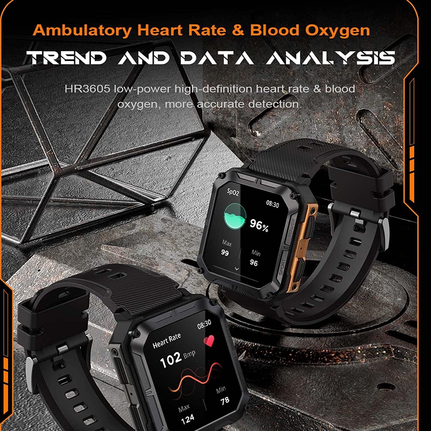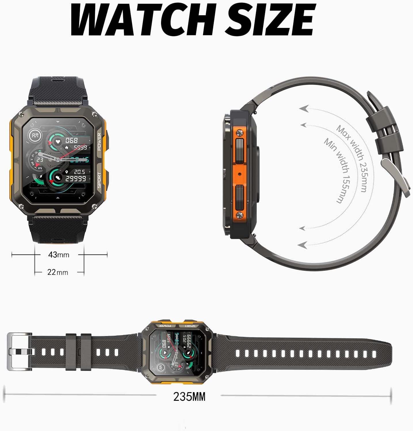 - ⌚【Perfect for Explorers】Special composite materials and metal shell makes this smart watch for men pass dozens of military standard tests, the tactical watch is waterproof, corrosion-resistant, drop-resistant and shock-resistant. The military watch can withstand extreme conditions with heat resistance to 70°C, cold resistance to -40°C, 240 hours in wet environments and 96 hours in salt spray, making it a must-have for outdoor sports and exploring.