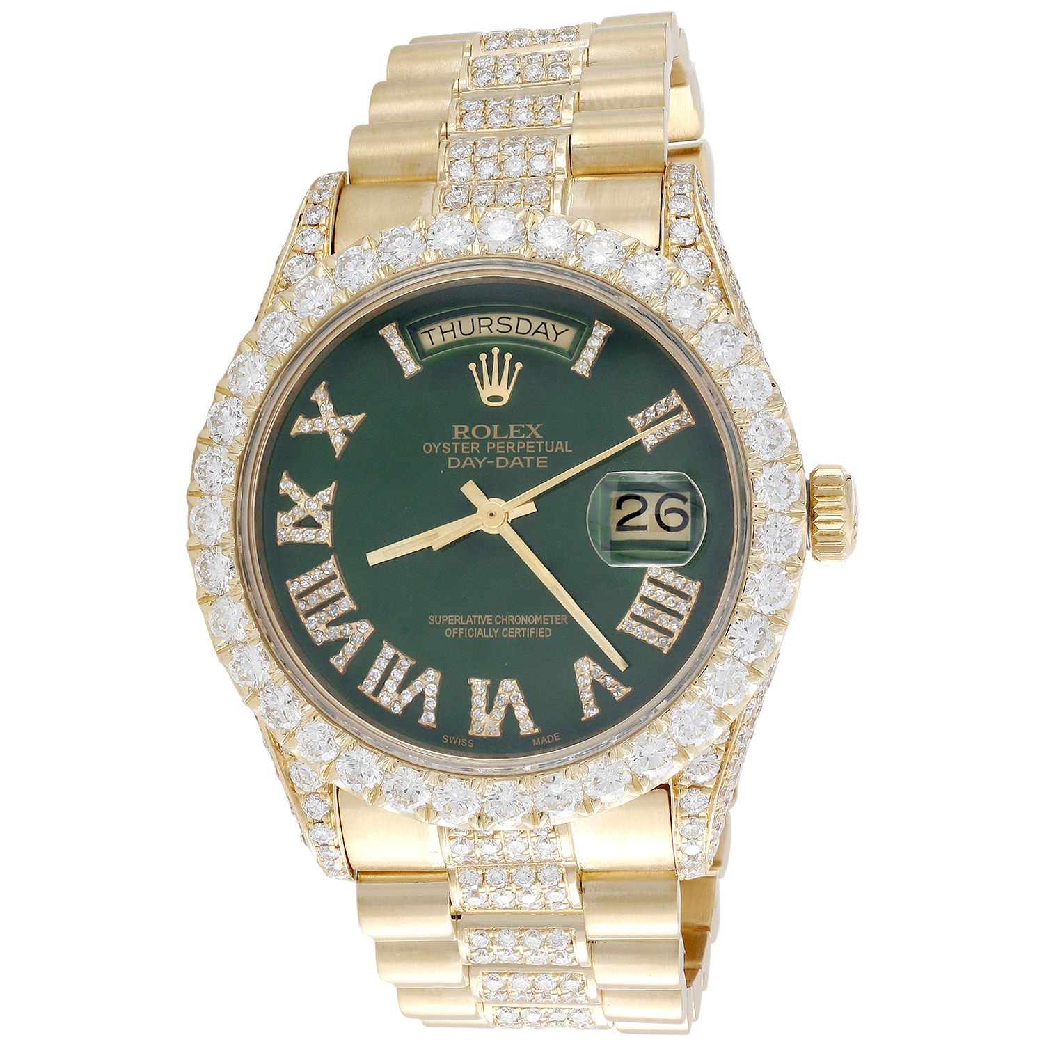 This 100% Genuine watch is Pre-Owned Rolex Day-Date President Model with Single Quick Set function. Ref. # 18038 come with 18K Yellow Gold custom fit diamond bezel. It is a perfect fit for this model. The diameter of this watch is totals 38mm after the custom bezel if fitted. This watch has 10.73 ct. t.w. of genuine diamonds which are all hand set by an experienced diamond setter. This case of this watch is in excellent condition (no dings, dents or scratches) and looks Brand-New on the wrist with visible model and serial #'s in between the lugs. The 18k bracelet is added to the watch is aftermarket and is made in Italy. This watch comes with the original Rolex Box and appraisal certificate for diamonds (insurance purpose). Recently serviced, this watch comes with in-house warranty for time keeping.