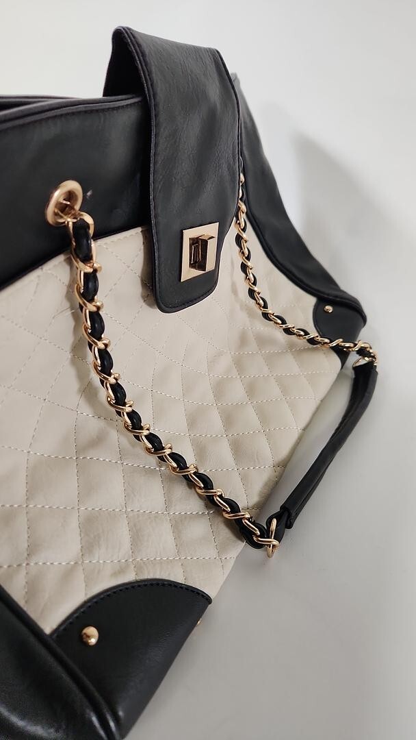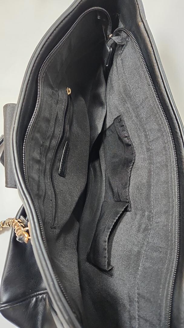 The bag is medium-sized and has a black lining with inner pockets for added organization. The exterior material is unknown, but the hardware is gold-plated.