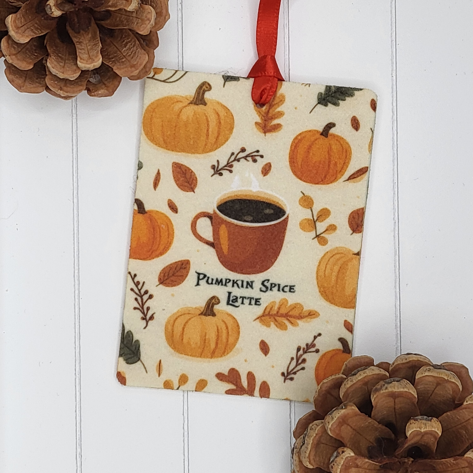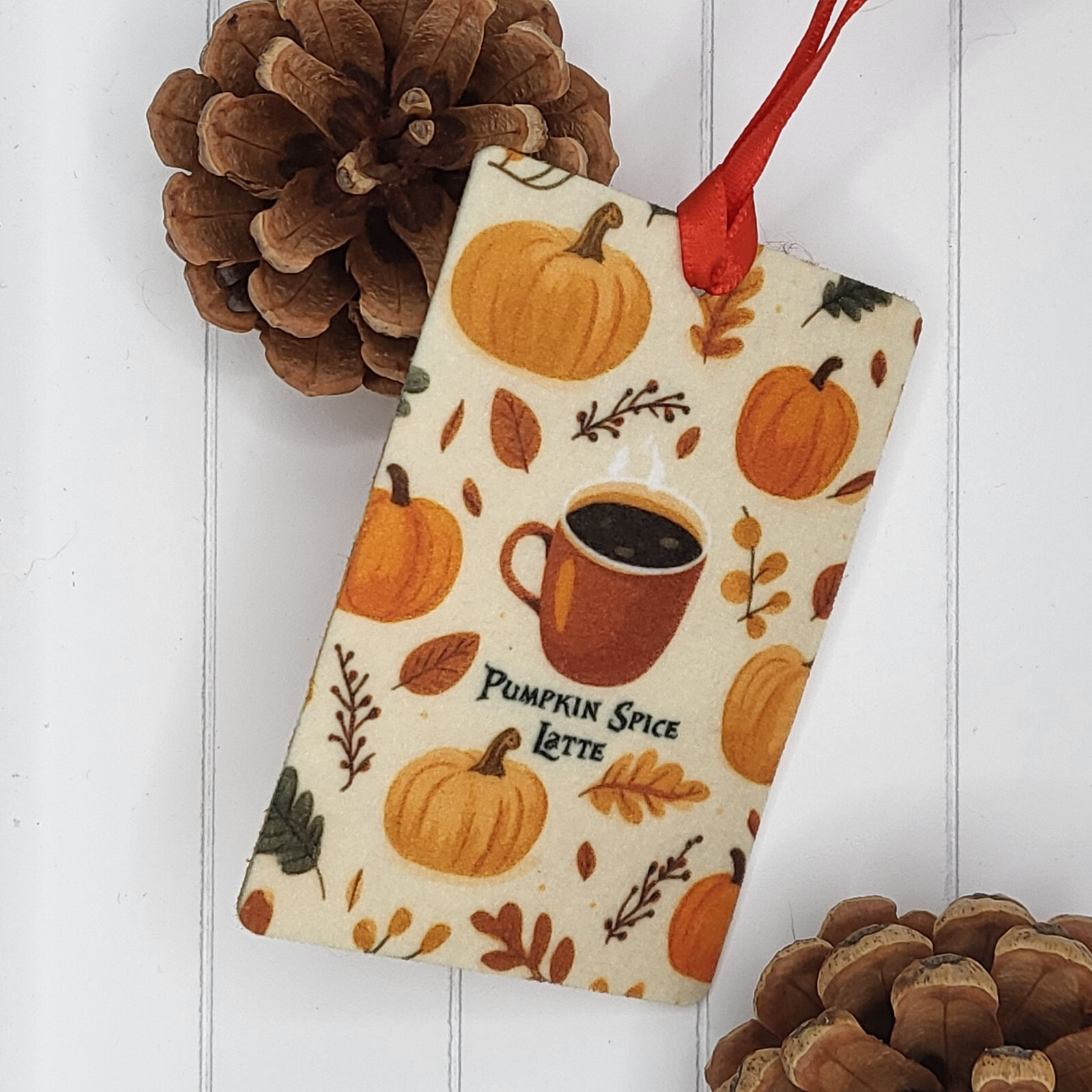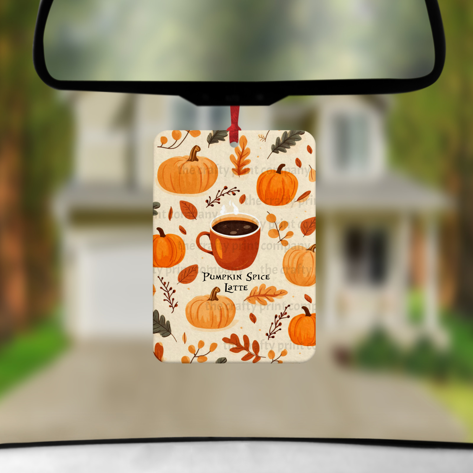Fantastic Autumn Pumpkin Spice Latte Design Car Air Freshener comes in a Rectangle shape printed on both sides and measure 95mm x 65mm and comes with bag and ribbon.