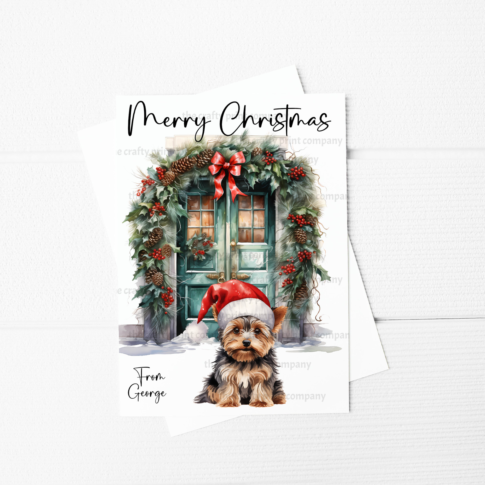 Merry Christmas Card with a Yorkshire Terrier sitting in front of a Christmas front door.