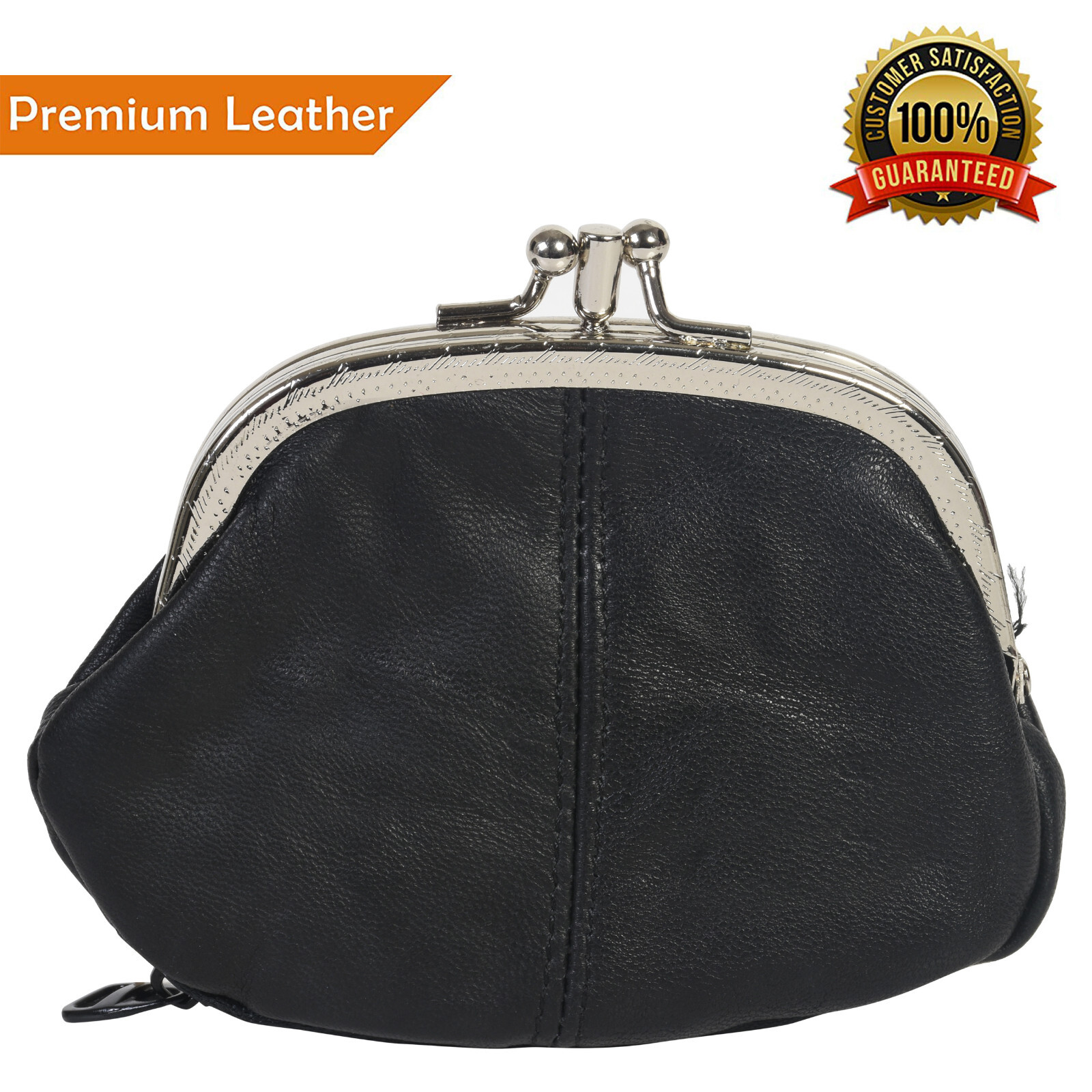 Made of genuine soft leather, this coin purse has a double metallic frame, i.e. it has two coin purses in one. There is also a zipper pocket between the two, which opens at the bottom. It is approx. 3.1/2 inches high and approx. 5 inches long at the longest point. The length of the zipper at the bottom is approx. 3.1/2. Very hard to find wallet. A REALLY GREAT BUY.