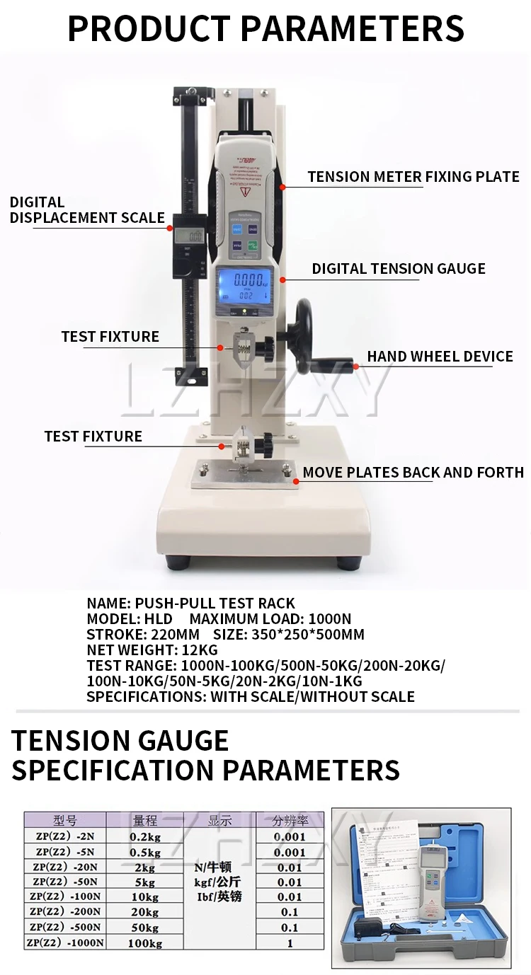 Test range: 1000N-100KG/500N-50KG/200N-20KG/100N-10KG/50N-5KG/20N-2KG/10N-1KG