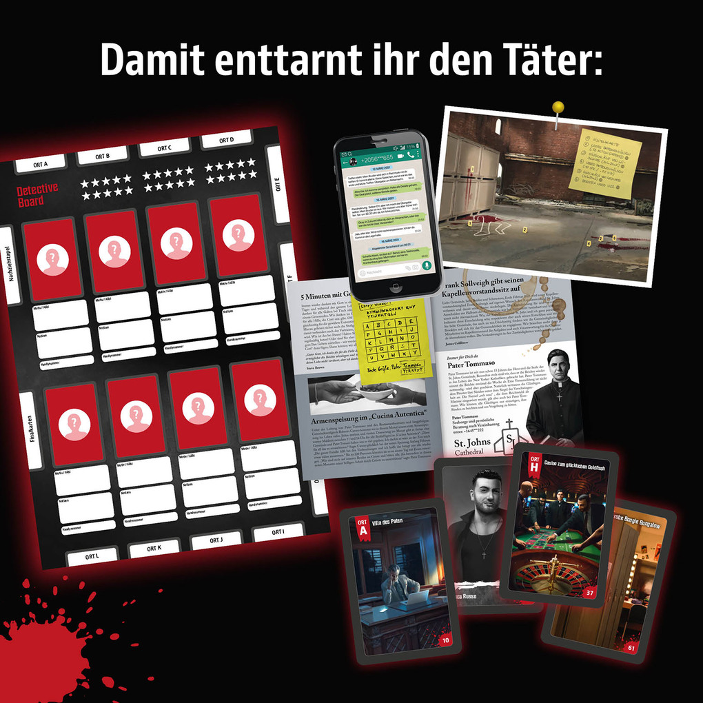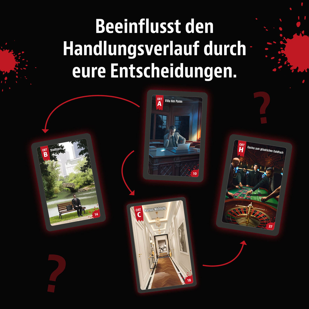 Erlebt das story-basierte, immersive Krimi-Spielerlebnis. Kooperativ Entscheidungen treffen, Rätsel lösen und Beweise sichten. Ein Mord - zahlreiche Möglichkeiten - Welchen Weg werdet ihr wählen? Interaktive Website, Google und digitale Features unterstützen beim Lösen des Falls. Ermittelt in der Mafia-Familie und findet den Verräter in den Reihen des Paten. Entdeckt noch mehr aus der Brettspiel-Reihe Masters of Crime. Für 1-6 Spielerinnen und Spieler ab 14 Jahren. Der Pate hat einen schlimmen Verdacht: Jemand aus der eigenen Familie ist ein übler Verräter! Nur wer? Eine Spurensuche in New York beginnt. Als enge Vertraute des Paten machen die ein bis sechs Spielerinnen und Spieler sich auf, herauszufinden, wer der Maulwurf in der eigenen Familie ist. Dafür sammeln sie wie Hinweise, befragen Verdächtige und lösen knifflige Rätsel. Alle Entscheidungen haben Einfluss darauf, wie sich die Geschichte weiterentwickeln wird. Neben dem umfangreichem Spielmaterial ist das Internet mit Google Maps, E-Mails und besonderen Websites Teil des Spiels. Wer ist das abtrünnige Mafia-Mitglied? Ein interaktives Krimi-Spiel für Zuhause.
