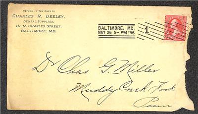 USA Scott #267 stamp tied by May 26, 1896 Baltimore, Maryland machine cancel on Charles R. Deeley, Dental Supplies advertising cover sent to Muddy Creek Fork, Pennsylvania with receiver.